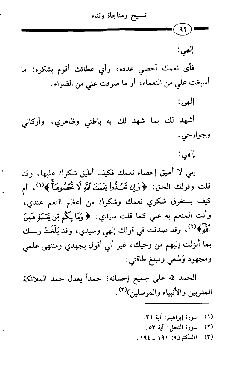 إني لا أطيق إحصاء نعمك فكيف أطيق شكرك عليها، وقد قلت وقولك الحق: {وَإِن تَعُدُّوا نِعْمَتَ اللهِ لاَ تُحْصُوهَا (¬1)}، أم كيف يستغرق شكري نعمك وشكرك من أعظم النعم عندي، وأنت المنعم به علي كما قلت سيدي: {وَمَا بِكُم مِّن نِّعْمَةٍ فَمِنَ اللهِ (¬2)}، وقد صدقت في قولك إلهي وسيدي، وقد بَلّغَتْ رسلك بما أنزلت إليهم من وحيك، غير أني أقول بجهدي ومنتهى علمي ومجهود وُسْعي ومبلغ طاقتي: