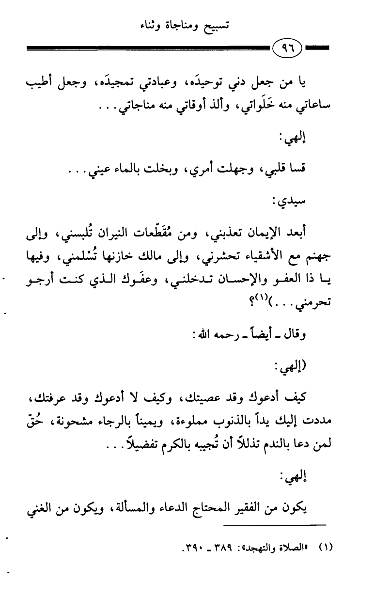 يا من جعل دني توحيدَه، وعبادتي تمجيدَه، وجعل أطيب ساعاتي منه خَلَواتي، وألذ أوقاتي منه مناجاتي ...