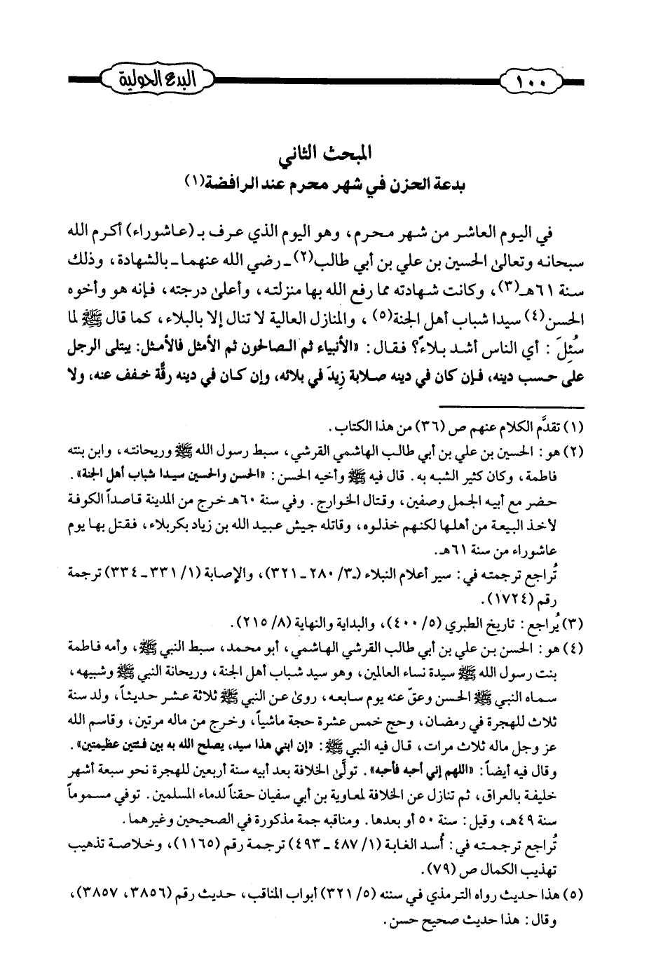 في اليوم العاشر من شهر محرم، وهو اليوم الذي عرف بـ (عاشوراء) أكرم الله سبحانه وتعالى الحسين بن علي بن أبي طالب - رضي الله عنهما - بالشهادة، وذلك سنة 61هـ (¬2) ، وكانت شهادته مما رفع الله بها منزلته، وأعلى درجته، فإنه هو وأخوه الحسن سيد اشباب أهل الجنة (¬3) ، والمنازل العالية لا تنال إلا بالبلاء، كما قال صلى الله عليه وسلم لما سُئِل: أي الناس أشد بلاءً؟ فقال: ((الأنبياء ثم الصالحون ثم الأمثل فالأمثل: يبتلى الرجل على حسب دينه، فإن كان في دينه صلابة زيد في بلائه، وإن كان في دينه رقّة خفف عنه، ولا