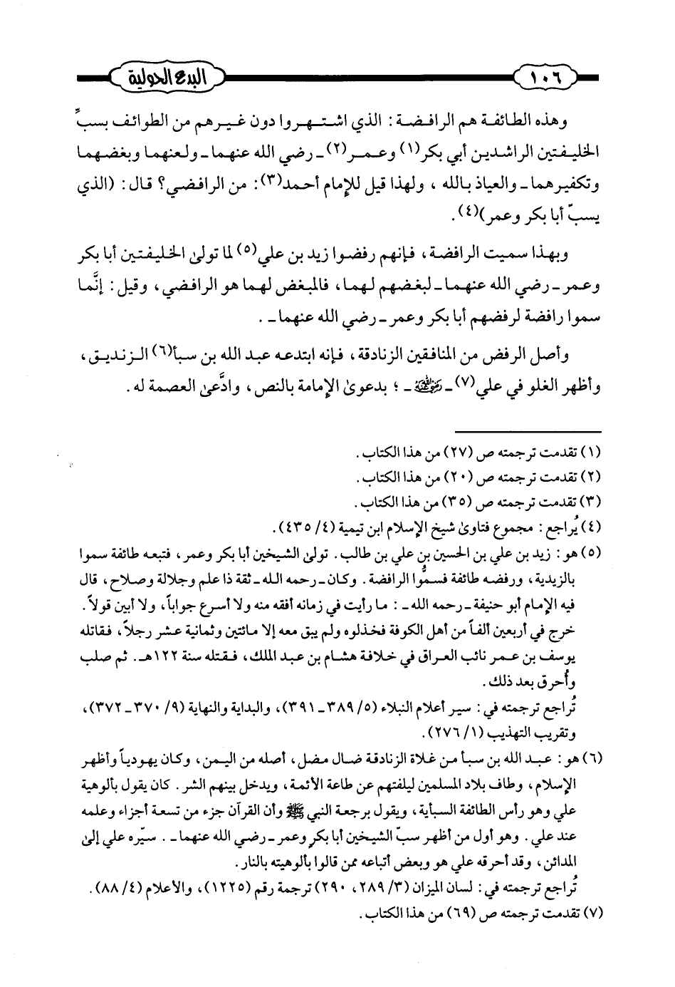 وهذه الطائفة هم الرافضة: الذين اشتهروا دون غيرهم من الطوائف بسبِّ الخليفتين الراشدين أبي بكر وعمر - رضي الله عنهما-ولعنهما وبغضهما وتكفيرهما-والعياذ بالله، ولهذا قيل للإمام أحمد: من الرافضي؟ قال: (الذي يسبّ أبا بكر وعمر) (¬1) .