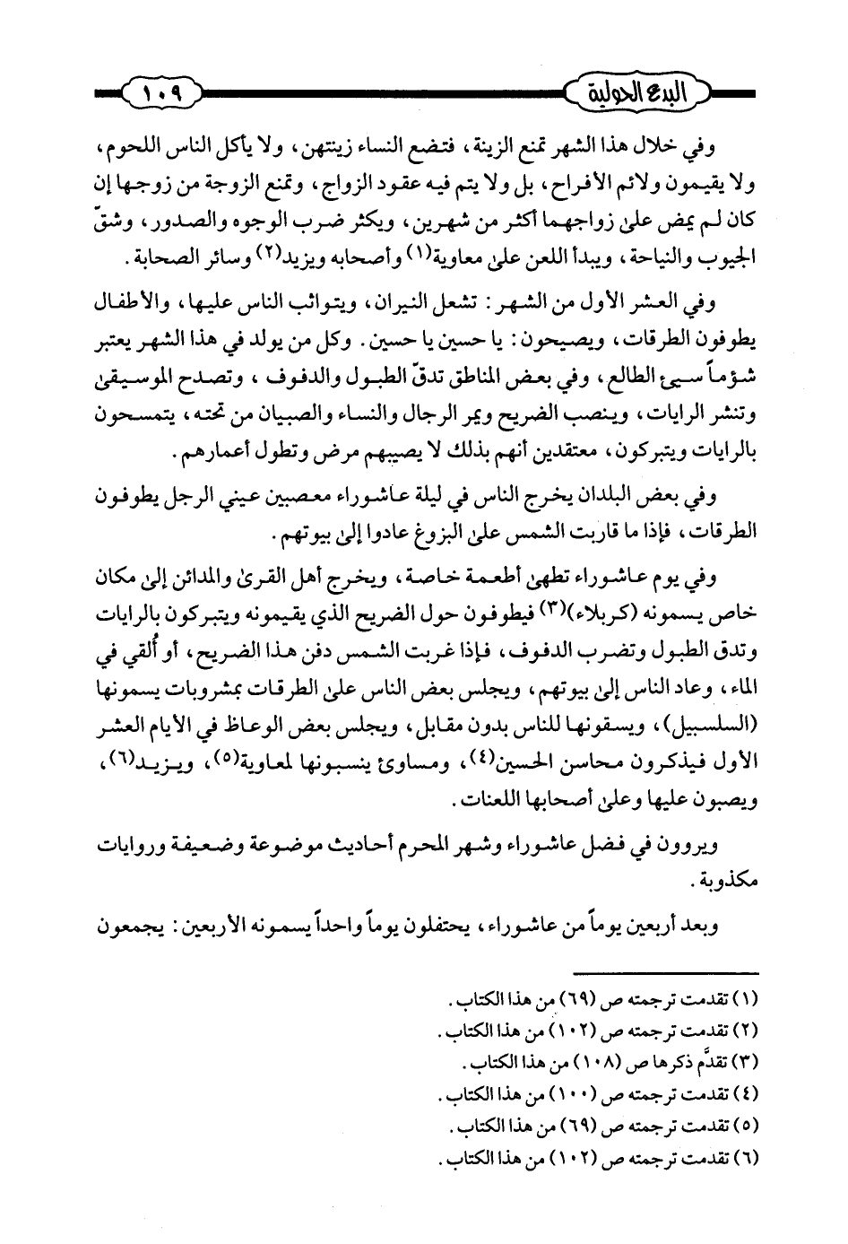 وفي يوم عاشوراء تطهى أطعمة خاصة، ويخرج أهل القرى والمدائن إلى مكان خاص يسمونه (كربلاء) فيطوفون حول الضريح الذي يقيمونه ويتبركون بالرايات وتدق الطبول وتضرع الدفوف، فإذا غربت الشمس دفن هذا الضريح، أو ألقي في الماء، وعاد الناس إلى بيوتهم، ويجلس بعض الناس على الطرقات بمشروبات يسمونها (السلسبيل) ، ويسقونها للناس بدون مقابل، ويجلس بعض الوعاظ في الأيام العشر الأول فيذكرون محاسن الحسين، ومساوئ ينسبونها لمعاوية، ويزيد، ويصبون عليها وعلى أصحابها اللعنات.