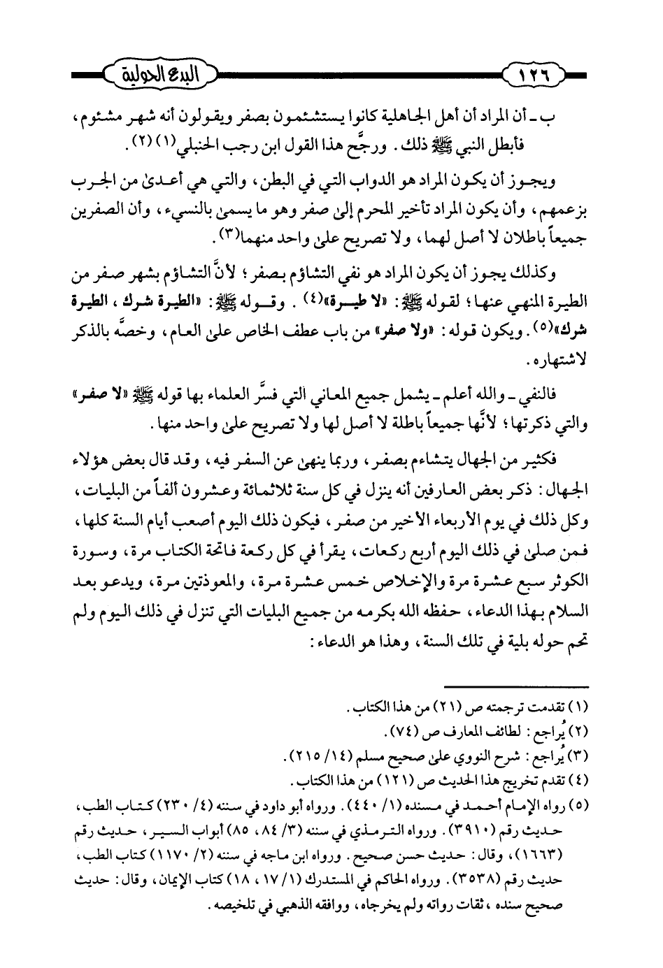 فكثير من الجهال يتشاءم بصفر، وربما ينهى عن السفر فيه، وقد قال بعض هؤلاء الجهال: ذكر بعض العارفين أنه ينزل في كل سنة ثلاثمائة وعشرون ألفاً من البليات، وكل ذلك في يوم الأربعاء الأخير من صفر، فيكون ذلك اليوم أصعب أيام السنة كلها، فمن صلى في ذلك اليوم أربع ركعات، يقرأ في كل ركعة فاتحة الكتاب مرة، وسورة الكوثر سبع عشرة مرة والإخلاص خمس عشرة مرة، والمعوذتين مرة، ويدعو بعد السلام بهذا الدعاء، حفظه الله بكرمه من جميع البليات التي تنزل في ذلك اليوم ولم تحم حوله بلية في تلك السنة، وهذا هو الدعاء:
