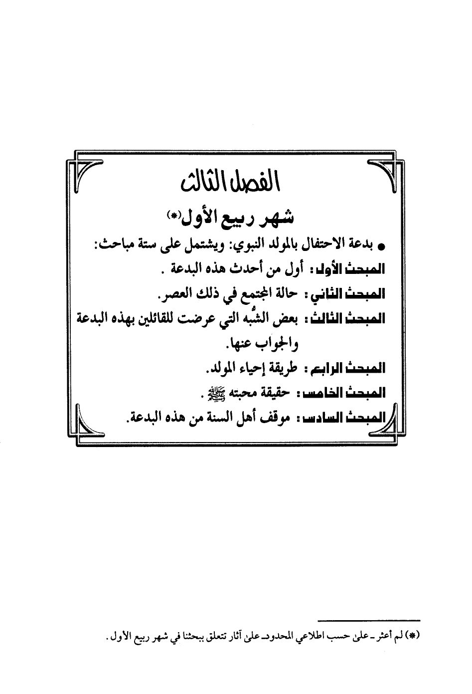 بدعة الاحتفال بالمولد النبوي: ويشمل على ستة مباحث: