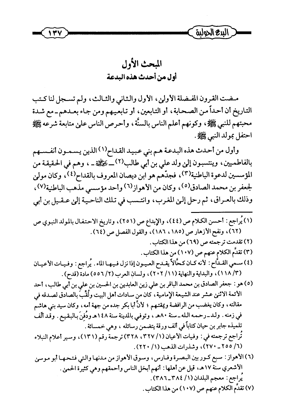 وأول من أحدث هذه البدعة هم بني عبيد القداح (¬1) الذين يسمون أنفسهم بالفاطميين، وينتسبون إلى ولد علي أبي طالب- رضي الله عنه-، وهم في الحقيقة من المؤسسين لدعوة الباطنية، فجدهم هو ابن ديصان المعروف بالقداح، وكان مولى لجعفر بن محمد الصادق، وكان من الأهواز (¬2) وأحد مؤسسي مذهب الباطنية، وذلك بالعراق، ثم رحل إلى المغرب، وانتسب في تلك الناحية إلى عقيل بن أبي