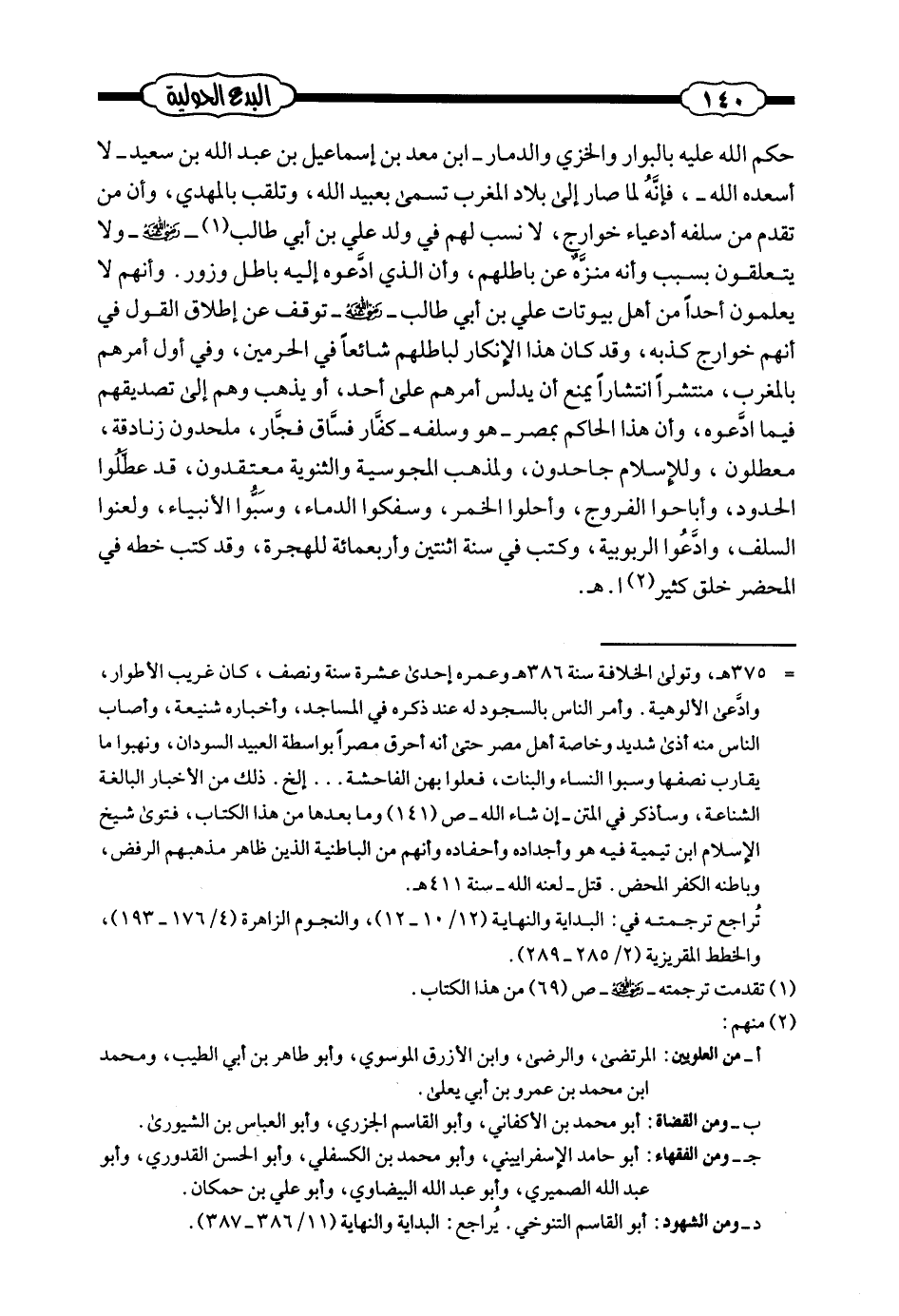 حكم الله عليه بالبوار والخزي والدمار- ابن معد بن إسماعيل بن عبد الله بن سعيد- لا أسعده الله -، فإنَّهُ لما صار إلى بلاد المغرب تسمى بعبيد الله، وتلقب بالمهدي، وأن من تقدم من سلفه أدعياء خوارج، لا نسب لهم في ولد علي بن أبي طالب- رضي الله عنه- ولا يعلمون أحداً من أهل بيوتات على بن أبي طالب-رضي الله عنه- توقف عن إطلاق القول في أنهم خوارج كذبه، وقد كان هذا الإنكار لباطلهم شائعاً في الحرمين، وفي أول أمرهم بالمغرب، منتشراً انتشاراً يمنع أن يدلس أمرهم على أحد، أو يذهب وهم إلى تصديقهم فيما ادَّعوه، وأن هذا الحاكم بمصر- هو وسلفه-كفار فساق فجار، ملحدون زنادقة، معطلون، وللإسلام جاحدون، ولمذهب المجوسية والوثنية معتقدون، قد عطَّلُوا الحدود، وأباحوا الفروج، وأحلوا الخمر، وسفكوا الدماء، وسَبُّوا الأنبياء، ولعنوا السلف، وادَّعُوا الربوبية، وكتب في سنة اثنتين وأربعمائة للهجرة، وقد كتب خطه في المحضر خلق كثير (¬1) ا. هـ.