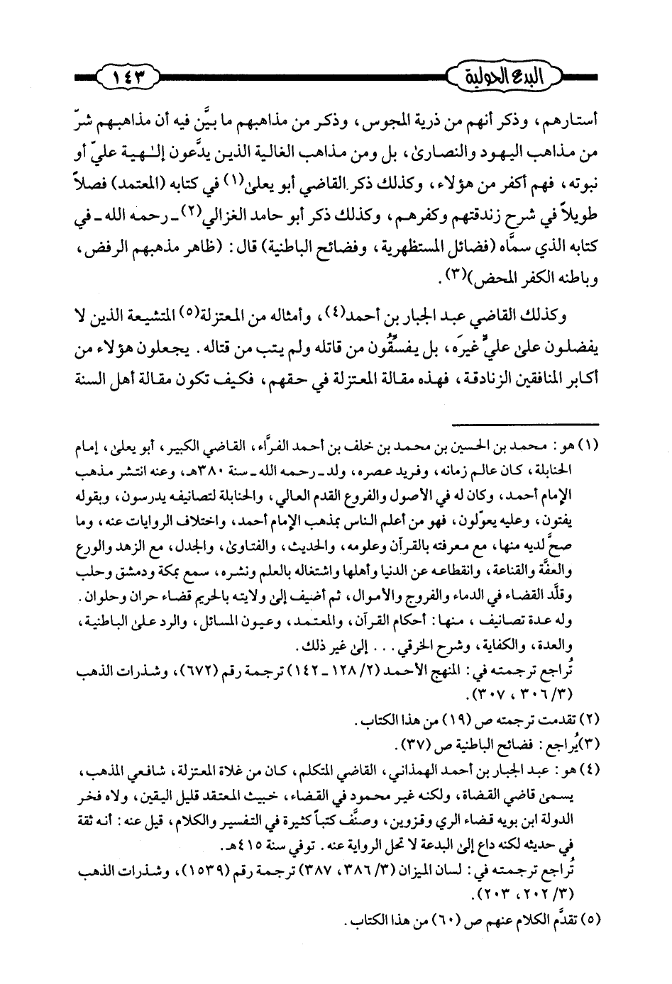 أستارهم، وذكر أنهم من ذرية المجوس، وذكر من مذاهبهم ما بيَّن فيه أن مذاهبهم شر من مذاهب اليهود والنصارى، بل ومن مذاهب الغالية الذين يدَّ إلهية عليّ أو نبوته، فهم أكفر من هؤلاء، وكذلك ذكر القاضي أبو يعلى في كتابه (المعتمد) فصلاً طويلاً في شرح زندقتهم وكفرهم، وكذلك ذكر أبو حامد الغزالي- رحمه الله- في كتابه الذي سمَّاه (فضائل المستظهرية، وفضائح الباطنية) قال: (ظاهر مذهبهم الرفض، وباطنه الكفر المحض) (¬1) .