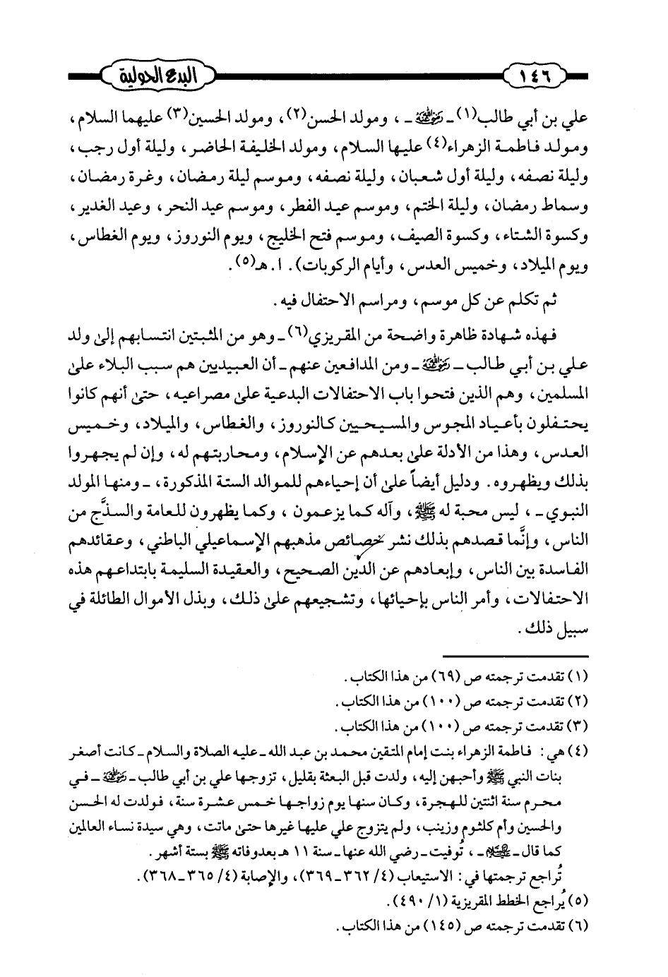علي بن أبي طالب - رضي الله عنه - ومولد الحسن، ومولد الحسين عليهما السلام، ومولد فاطمة الزهراء عليها السلام، ومولد الخليفة الحاضر، وليلة أول رجب، وليلة نصفه، وليلة أول شعبان، وليلة نصفه، وموسم ليلة رمضان، وغرة رمضان، وسماط رمضان، وليلة الختم، وموسم عيد الفطر، وموسم عيد النحر، وعيد الغدير، وكسوة الشتاء، وكسوة الصيف، وموسم فتح الخليج، ويوم النوروز، ويوم الغطاس، ويوم الميلاد، وخميس العدس، وأيام الركوبات) . ا. هـ (¬1) .