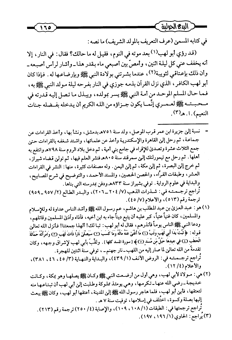 (قد رؤي أبو لهب بعد موته في النوم، فقيل له ما حالك؟ فقال: في النار، إلا أنه يخفف عني كل ليلة اثنين، وأمص بين أصبعي ماء بقدر هذا- وأشار لرأس أصبعه-وأن ذلك بإعتاقي لثويبة، عندما بشرتني بولادة النبي صلى الله عليه وسلم وبإرضاعها له. فإذا كان أبو لهب الكافر، الذي نزل القرآن بذمه جوزي في النار بفرحة ليلة مولد النبي صلى الله عليه وسلم به، فما حال المسلم الموحد من أمة النبي صلى الله عليه وسلم يسر بمولده، ويبذل ما تصل إليه قدرته في محبته صلى الله عليه وسلم لعمري إنما يكون جزاؤه من الله الكريم أن يدخله بفضله جنات النعيم) . ا. هـ (¬1) .