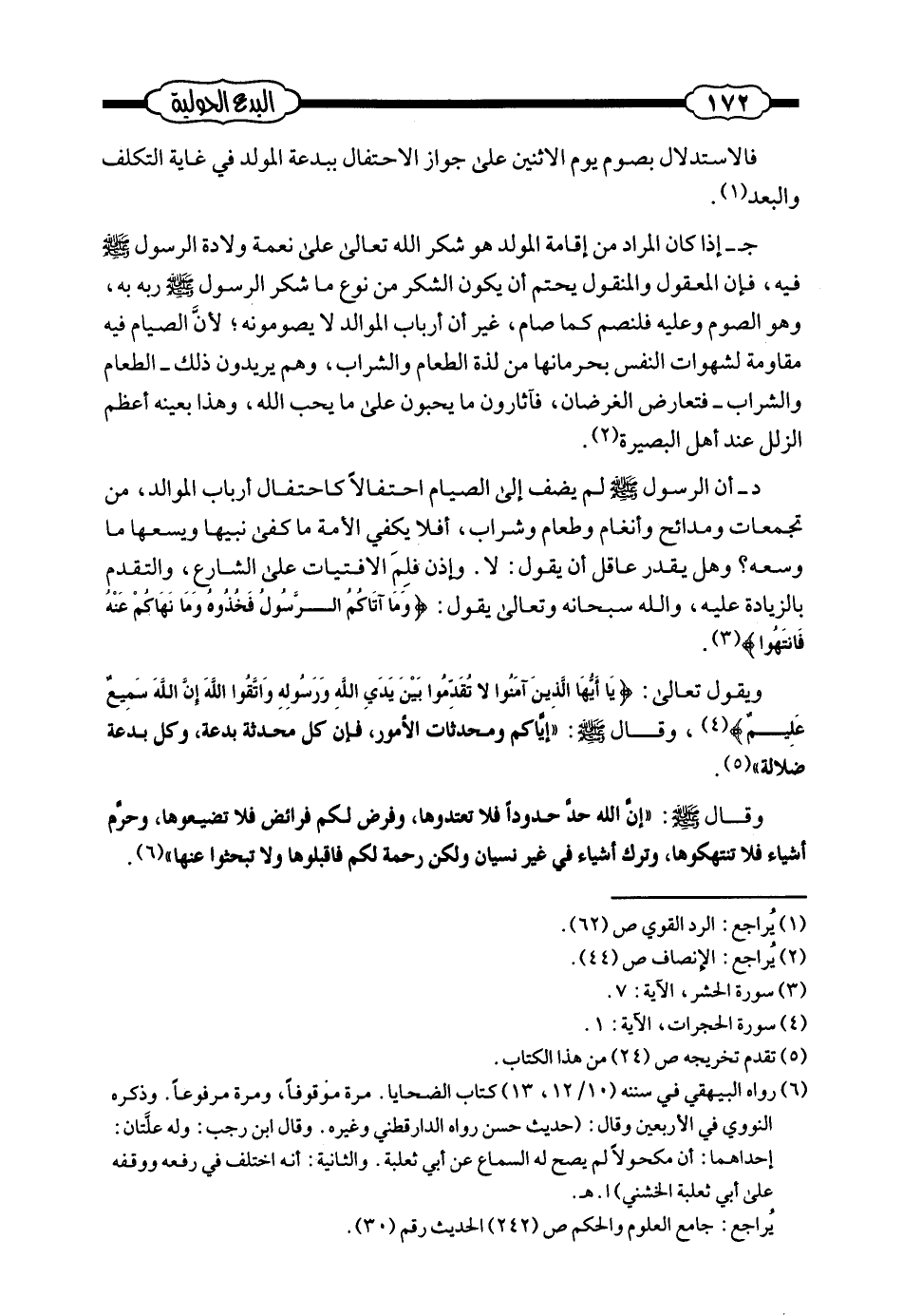 ويقول تعالى: {يَا أَيُّهَا الَّذِينَ آمَنُوا لا تُقَدِّمُوا بَيْنَ يَدَيِ اللَّهِ وَرَسُولِهِ وَاتَّقُوا اللَّهَ إِنَّ اللَّهَ سَمِيعٌ عَلِيمٌ} (¬4) ، وقال صلى الله عليه وسلم: ((إياكم ومحدثات الأمور، فإن كل محدثة بدعة، وكل بدعة ضلاله)) (¬5) .