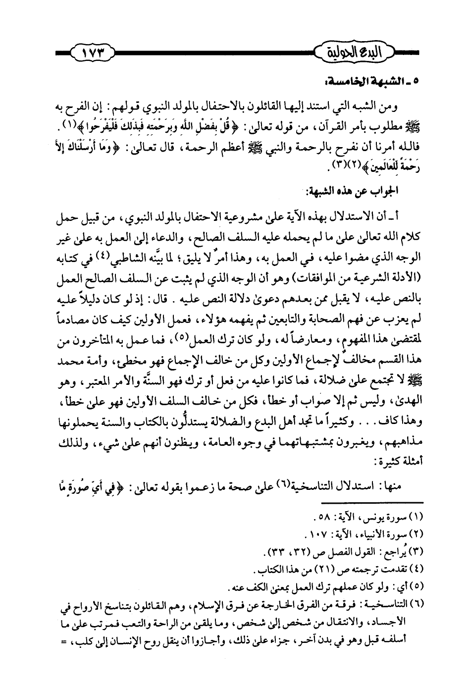 ومن الشبه التي استند إليها القائلون بالاحتفال بالمولد النبوي قولهم: إن الفرح به صلى الله عليه وسلم مطلوب بأمر القرآن، من قوله تعالى: {قُلْ بِفَضْلِ اللَّهِ وَبِرَحْمَتِهِ فَبِذَلِكَ فَلْيَفْرَحُوا} (¬1) . فالله أمرنا أن نفرح بالرحمة والنبي صلى الله عليه وسلم أعظم الرحمة، قال تعالى: {وَمَا أَرْسَلْنَاكَ إِلَّا رَحْمَةً لِلْعَالَمِينَ} (¬2) . (¬3) .