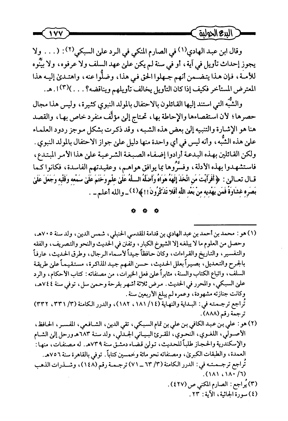 والشبه التي استند إليها القائلون بالاحتفال بالمولد النبوي كثيرة، وليس هذا مجال حصرها؛ لأن استقصاءها والإحاطة بها، تحتاج إلى مؤلف منفرد خاص بها، والقصد هنا هو الإشارة والتنبيه إلى بعض هذه الشبه، وقد ذكرت بشكل موجز ردود العلماء على هذه الشُّبه، وأنه ليس في أي واحدة منها دليل على جواز الاحتفال بالمولد النبوي. ولكن القائلين بهذه البدعة أرادوا إضفاء الصبغة الشرعية على هذا الأمر المبتدع، فاستشهدوا بهذه الأدلة، وفسَّرُوها بما يوافق هواهم، وعقيدتهم الفاسدة، فكانوا كما قال تعالى: {أَفَرَأَيْتَ مَنِ اتَّخَذَ إِلَهَهُ هَوَاهُ وَأَضَلَّهُ اللَّهُ عَلَى عِلْمٍ وَخَتَمَ عَلَى سَمْعِهِ وَقَلْبِهِ وَجَعَلَ عَلَى بَصَرِهِ غِشَاوَةً فَمَنْ يَهْدِيهِ مِنْ بَعْدِ اللَّهِ أَفَلا تَذَكَّرُونَ} (¬2) - والله أعلم -.