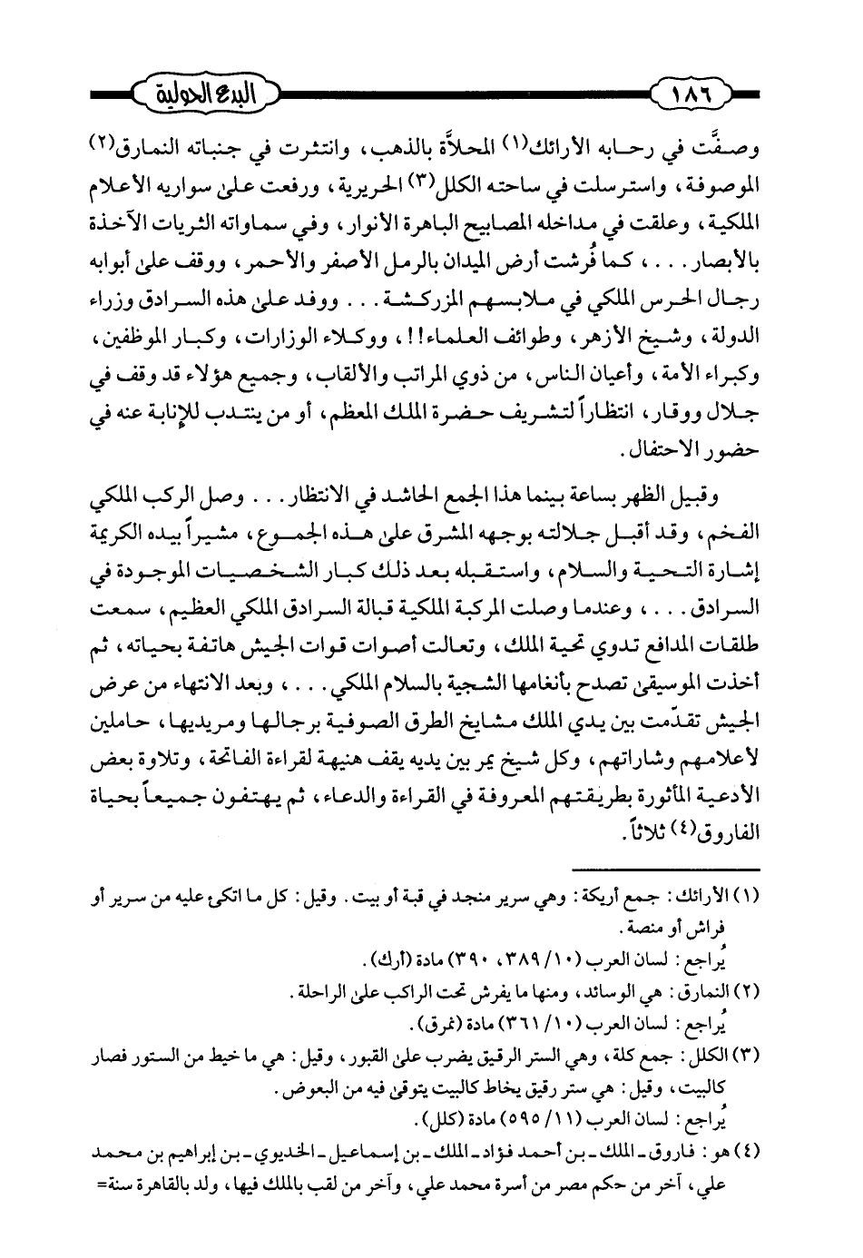 المحلاة بالذهب، وانتثرت في جنباته النمارق (¬2) الموصوفة، واسترسلت في ساحته الكلل (¬3) الحريرية، ورفعت على سواريه الأعلام الملكية، وعلقت في مداخله المصابيح الباهرة الأنوار، وفي سماواته الثريات الآخذة بالأبصار....، كما فُرشت أرض الميدان بالرمل الأصفر والأحمر، ووقف على أبوابه رجال الحرس الملكي في ملابسهم المزركشة ... ووفد على هذه السرادق وزراء الدولة، وشيخ الأزهر، وطوائف العلماء!!، ووكلاء الوزارات، وكبار الموظفين، وكبراء الأمة، وأعيان الناس، من ذوي المراتب والألقاب، وجميع هؤلاء قد وقف في جلال ووقار، انتظاراً لتشريف حضرة الملك المعظم، أو من ينتدب للإنابة عنه في حضور الاحتفال.