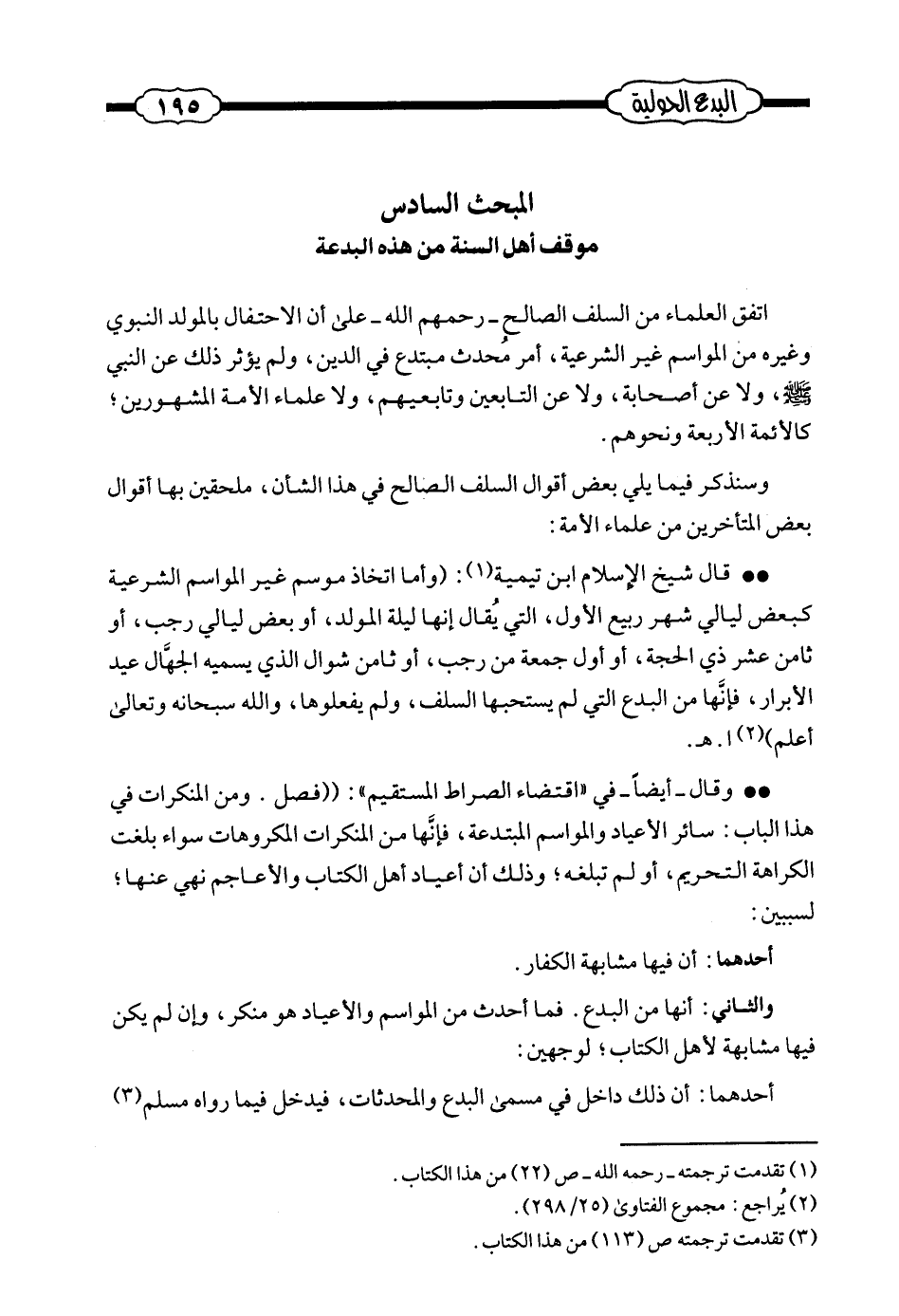 وقال - أيضاً - في ((اقتضاء الصراط المستقيم)) : ((فصل. ومن المنكرات في هذا الباب: سائر الأعياد والمواسم المبتدعة، فإنها من المنكرات المكروهات سواء بلغت الكراهة التحريم، أو لم تبلغه؛ وذلك أن أعياد أهل الكتاب والأعاجم نهي عنها؛ لسببين: