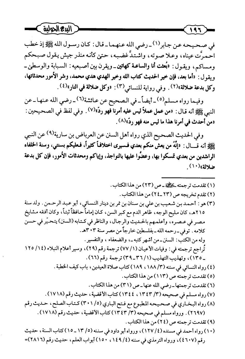 في صحيحه عن جابر - رضي الله عنهما - قال: كان رسول الله صلى الله عليه وسلم إذ خطب احمرت عيناه، وعلا صوته، واشتد غضبه، حتى كأنه منذر جيش يقول صبحكم ومساكم، ويقول: ((بُعثت أنا والساعة كهاتين - ويقرن بين أصبعيه: السبابة والوسطى - ويقول: ((أما بعد، فإن خير الحديث كتاب الله، وخير الهدي هدي محمد، وشر الأمور محدثاتها، وكل بدعة ضلالة)) (¬1) وفي رواية للنسائي: ((وكل بدعة ضلالة في النار)) (¬2)