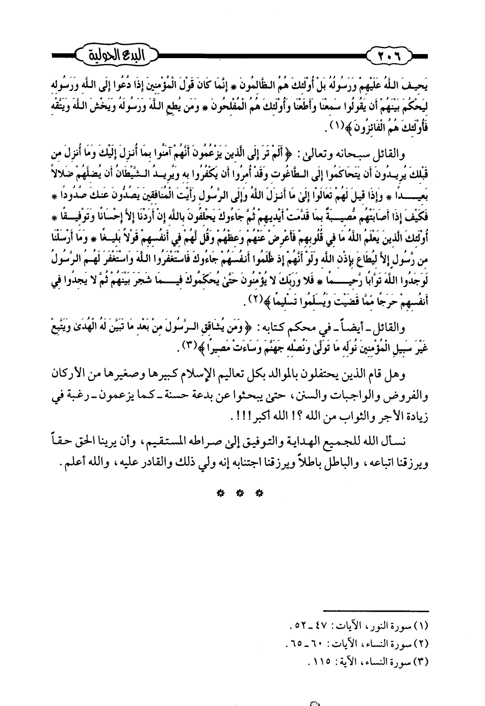 والقائل - أيضاً -في محكم كتابه: {وَمَنْ يُشَاقِقِ الرَّسُولَ مِنْ بَعْدِ مَا تَبَيَّنَ لَهُ الْهُدَى وَيَتَّبِعْ غَيْرَ سَبِيلِ الْمُؤْمِنِينَ نُوَلِّهِ مَا تَوَلَّى وَنُصْلِهِ جَهَنَّمَ وَسَاءَتْ مَصِيراً} (¬3) .