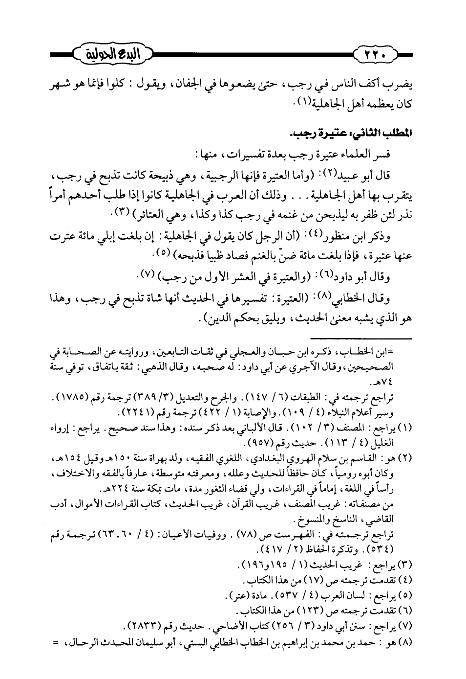 وقال الخطابي: (العتيرة: تفسيرها في الحديث أنها شاة تذبح في رجب، وهذا هو الذي يشبه معنى الحديث، ويليق بحكم الدين) .