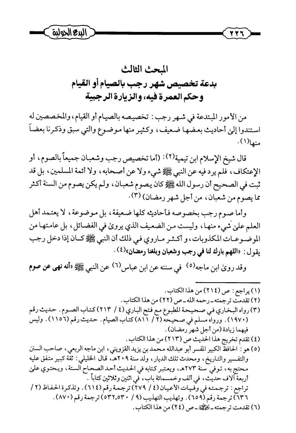قال شيخ الإسلام ابن تيمية: (أما تخصيص رجب وشعبان جميعاً بالصوم، أو الاعتكاف، فلم يرد فيه عن النبي صلى الله عليه وسلم شيء ولا عن أصحابه، ولا أئمة المسلمين، بل قد ثبت في الصحيح أن رسول الله صلى الله عليه وسلم كان يصوم شعبان، ولم يكن يصوم من السنة أكثر مما يصوم من شعبان، من أجل شهر رمضان) (¬1) .