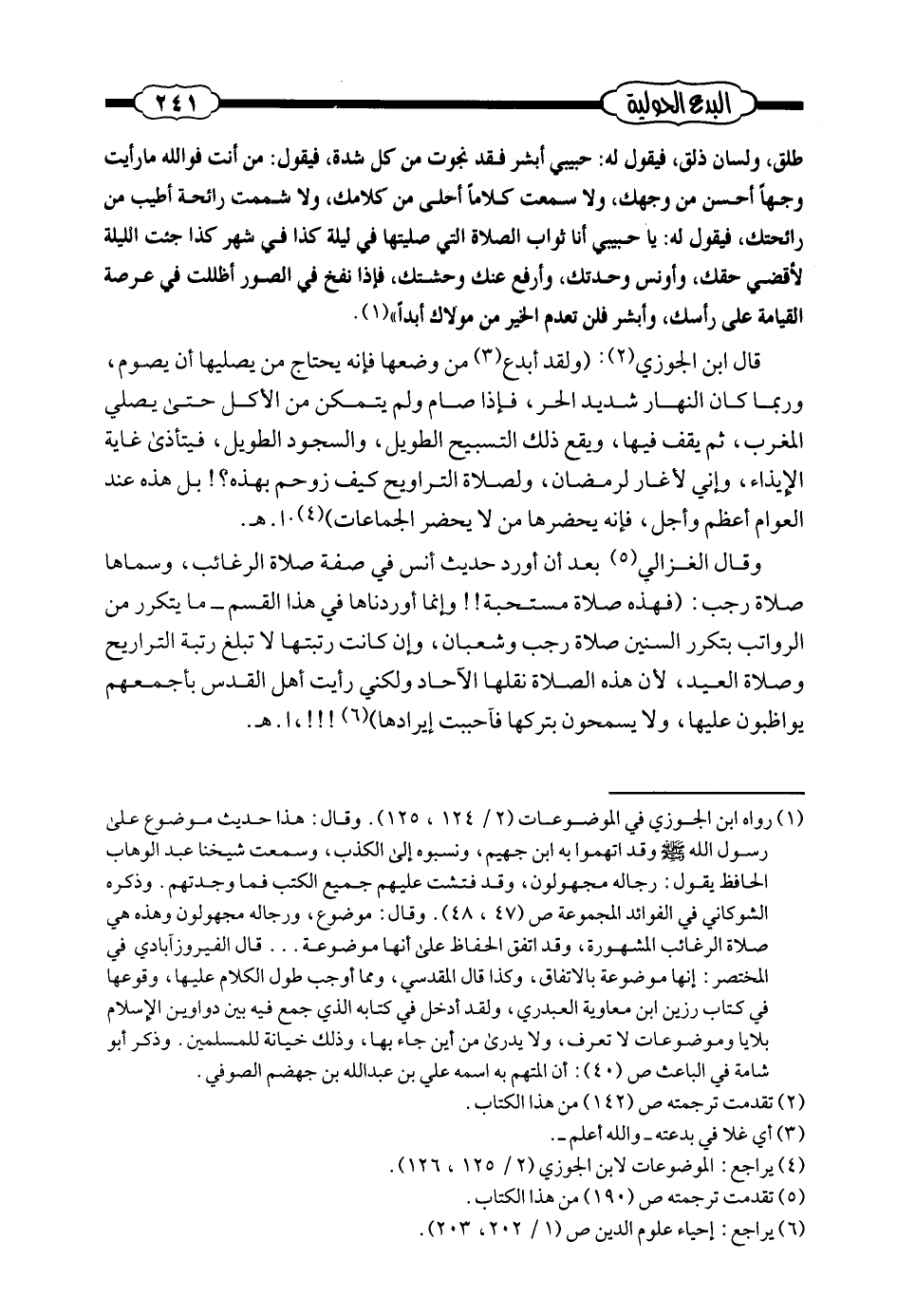 وقال الغزالي بعد أن أورد حديث أنس في صفة صلاة الرغائب، وسماها صلاة رجب: (فهذه صلاة مستحبة!! وإنما أوردناها في هذا القسم-ما يتكرر من الرواتب بتكرر السنين صلاة رجب وشعبان، وإن كانت رتبتها لا تبلغ رتبة التراويح وصلاة العيد، لأن هذه الصلاة نقلها الآحاد ولكني رأيت أهل القدس بأجمعهم يواظبون عليها، ولا يسمحون بتركها فآحببت إيرادها) (¬4) !! ا. هـ.