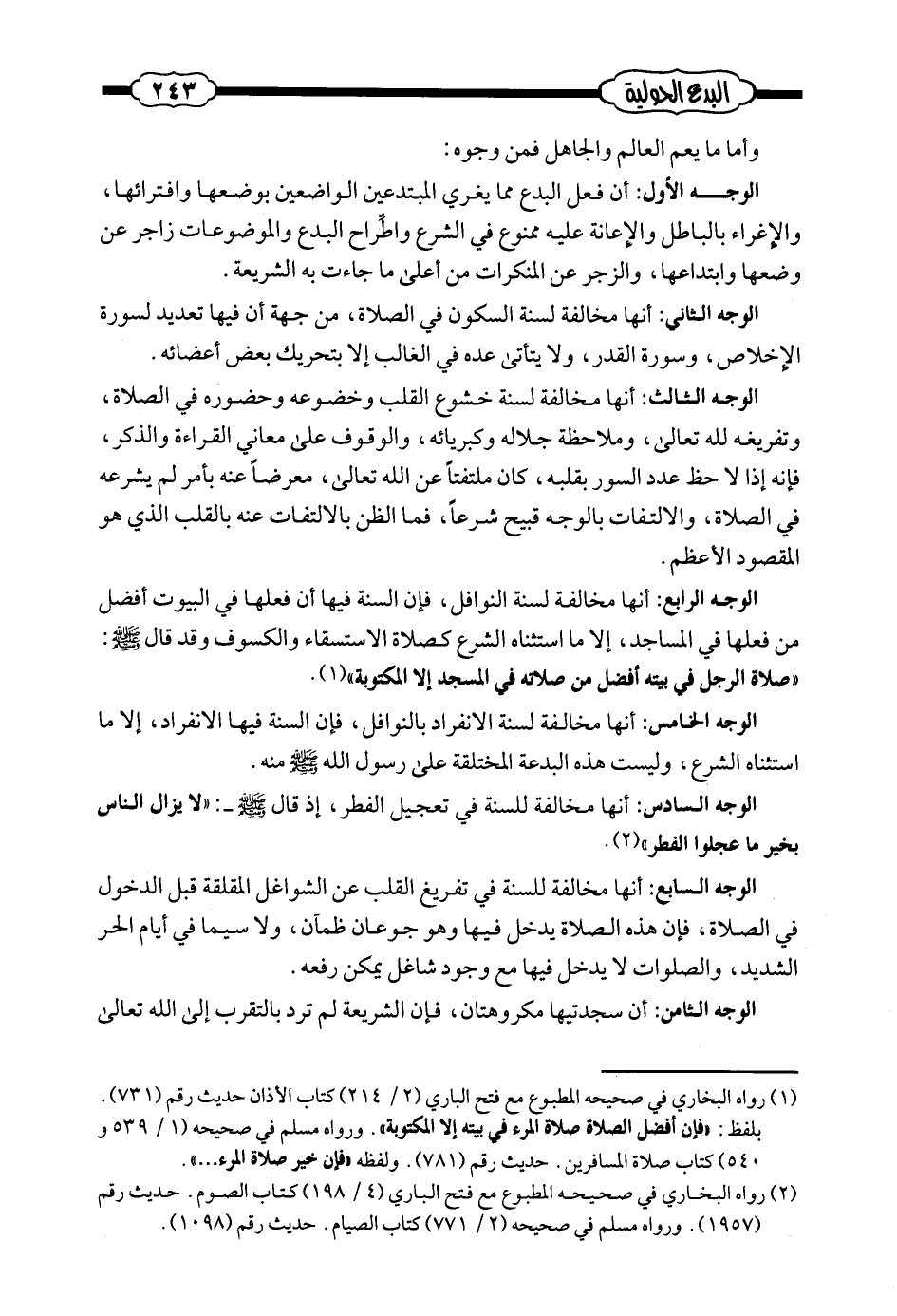 الوجه الرابع: أنها مخالفة لسنة النوافل، فإن السنة فيها أن فعلها في البيوت أفضل من فعلها في المساجد، إلا ما استثناه الشرع كصلاة الاستسقاء والكسوف وقد قال صلى الله عليه وسلم: ((صلاة الرجل في بيته أفضل من صلاته في المسجد إلا المكتوبة)) (¬1) .