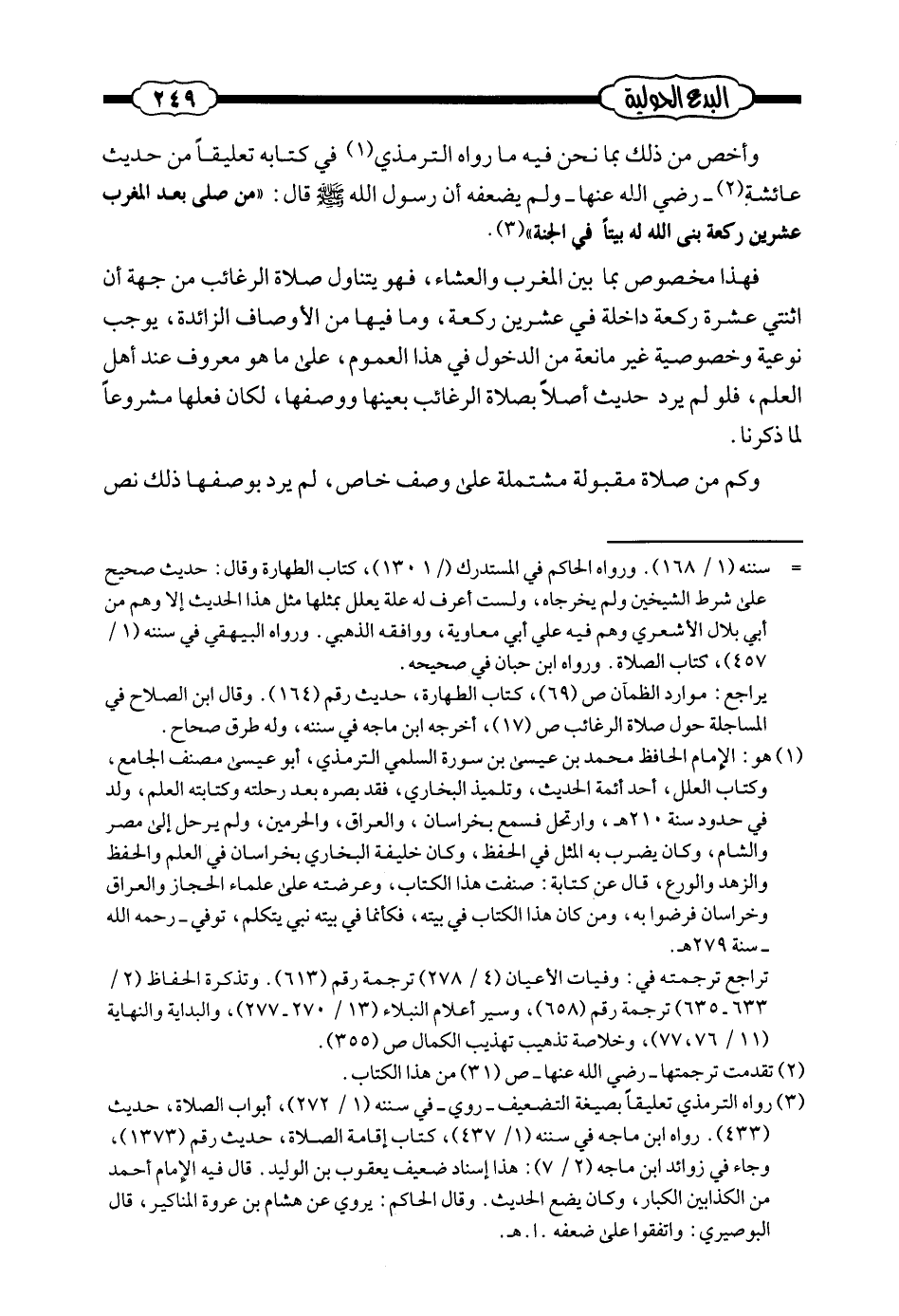 وأخص من ذلك بما نحن فيه ما رواه الترمذي في كتابه تعليقاً من حديث عائشة -رضي الله عنها- ولم يضعفه أن رسول الله صلى الله عليه وسلم قال: ((من صلى بعد المغرب عشرين ركعة بني الله له بيتاً في الجنة)) (¬1) .