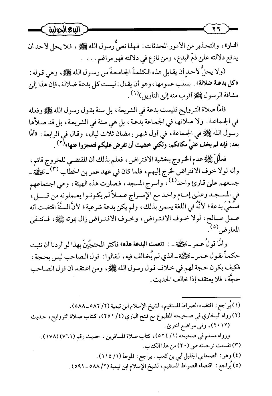 وأما قولُ عمر- رضي الله عنه-: ((نعمت البدعة هذه)) فأكثر المحتجِّين بهذا لو أردنا أن نثبت حكماً بقول عمر - رضي الله عنه- الذين لم يُخالف فيه، لقالوا: قول الصاحب ليس بحجة، فكيف يكون حجة لهم في خلاف قول رسول الله صلى الله عليه وسلم، ومن اعتقد أن قول الصاحب حجَّة، فلا يعتقده إذا خالف الحديث.