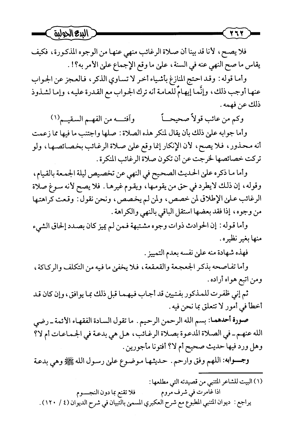 وأما جوابه على ذلك بأن يقال لمنكر هذه الصلاة: صلها واجتنب ما فيها مما زعمت أنه محذور، فلا يصح، لأن الإنكار إنما وقع على صلاة الرغائب بخصائصها، ولو تركت خصائصها لخرجت عن أن تكون صلاة الرغائب المنكرة.