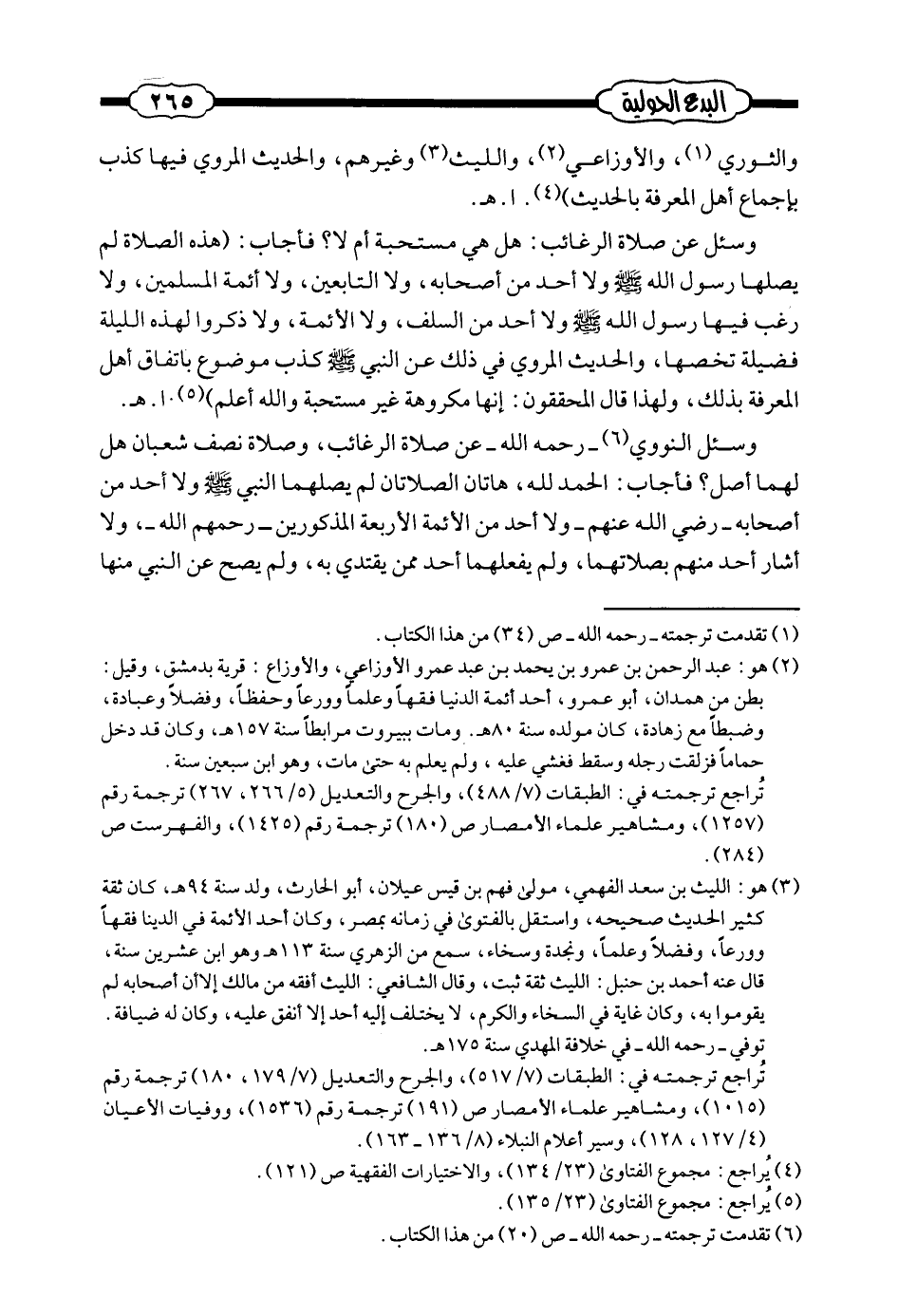 وسئل عن صلاة الرغائب: هل هي مستحبة أم لا؟ فأجاب: (هذه الصلاة لم يصلها رسول الله صلى الله عليه وسلم ولا أحد من أصحابه، ولا التابعين، ولا أئمة المسلمين، ولا رغب فيها رسول الله صلى الله عليه وسلم ولا أحد من السلف، ولا الأئمة، ولا ذكروا لهذه الليلة فضيلة تخصها، والحديث المروي في ذلك عن النبي صلى الله عليه وسلم كذب موضوع باتفاق أهل المعرفة بذلك، ولهذا قال المحققون: إنها مكروهة غير مستحبة والله أعلم) (¬2) . ا. هـ.