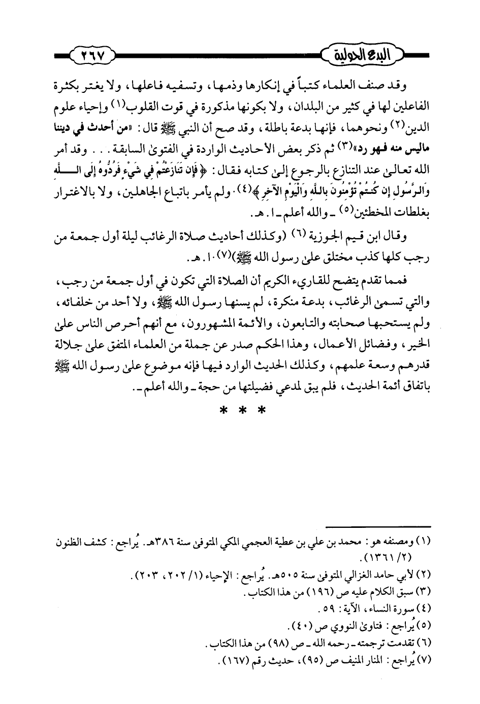 وقد صنف العلماء كتباً في إنكارها وذمها، وتسفيه فاعلها، ولا يغتر بكثرة الفاعلين لها في كثير من البلدان، ولا بكونها مذكورة في قوت القلوب (¬1) وإحياء علوم الدين (¬2) ونحوهما، فإنها بدعة باطلة، وقد صح أن النبي صلى الله عليه وسلم قال: ((من أحدث في ديننا ما ليس منه فهو رد)) ثم ذكر بعض الأحاديث الواردة في الفتوى السابقة..... وقد أمر الله تعالى عند التنازع بالرجوع إلى كتابه فقال: {فَإِنْ تَنَازَعْتُمْ فِي شَيْءٍ فَرُدُّوهُ إِلَى اللَّهِ وَالرَّسُولِ إِنْ كُنْتُمْ تُؤْمِنُونَ بِاللَّهِ وَالْيَوْمِ الْآخِرِ} (¬3) . ولم يأمر باتباع الجاهلين، ولا بالاغترار بغلطات المخطئين (¬4) - والله أعلم - ا. هـ.