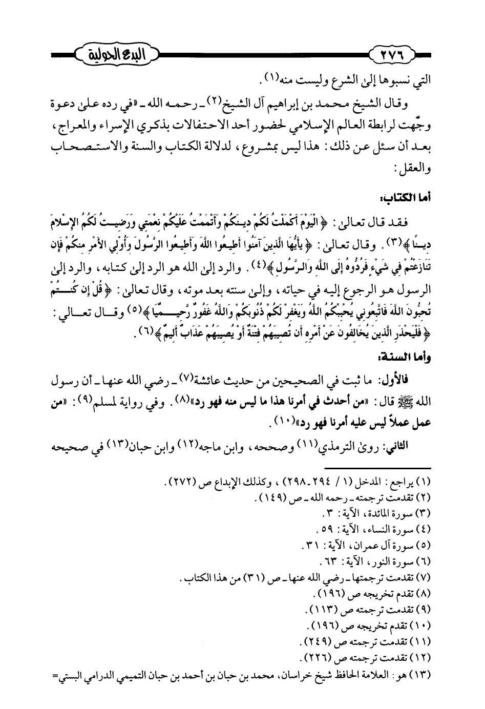 وقال الشيخ محمد بن إبراهيم آل الشيخ-رحمه الله- ((في رده على دعوة وجهت لرابطة العالم الإسلام لحضور أحد الاحتفالات بذكري الإسراء والمعراج، بعد أن سئل عن ذلك: هذا ليس بمشروع، لدلالة الكتاب والسنة والاستصحاب والعقل: