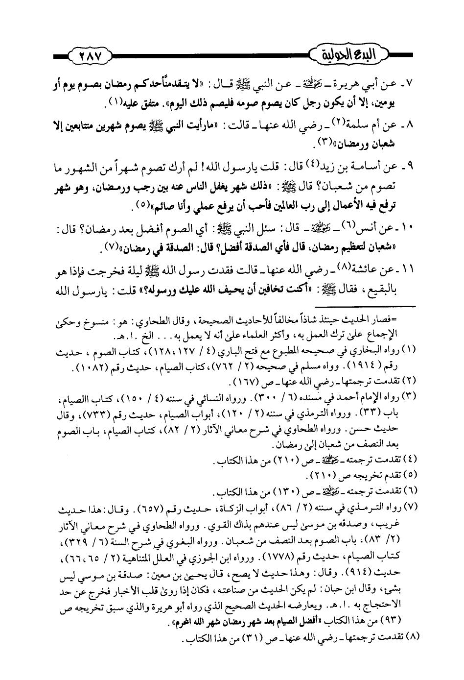 (¬2) - رواه الإمام أحمد في مسنده (6/ 300) . ورواه النسائي في سننه (4/150) كتاب الصيام، باب (33) . ورواه الترمذي في سننه (2/ 120) أبواب الصيام، حديث رقم (733) وقال حديث حسن. ورواه الطحاوي في شرح معاني الآثار (2/82) ، كتاب الصيام، باب الصوم بعد النصف من شعبان إلى رمضان.