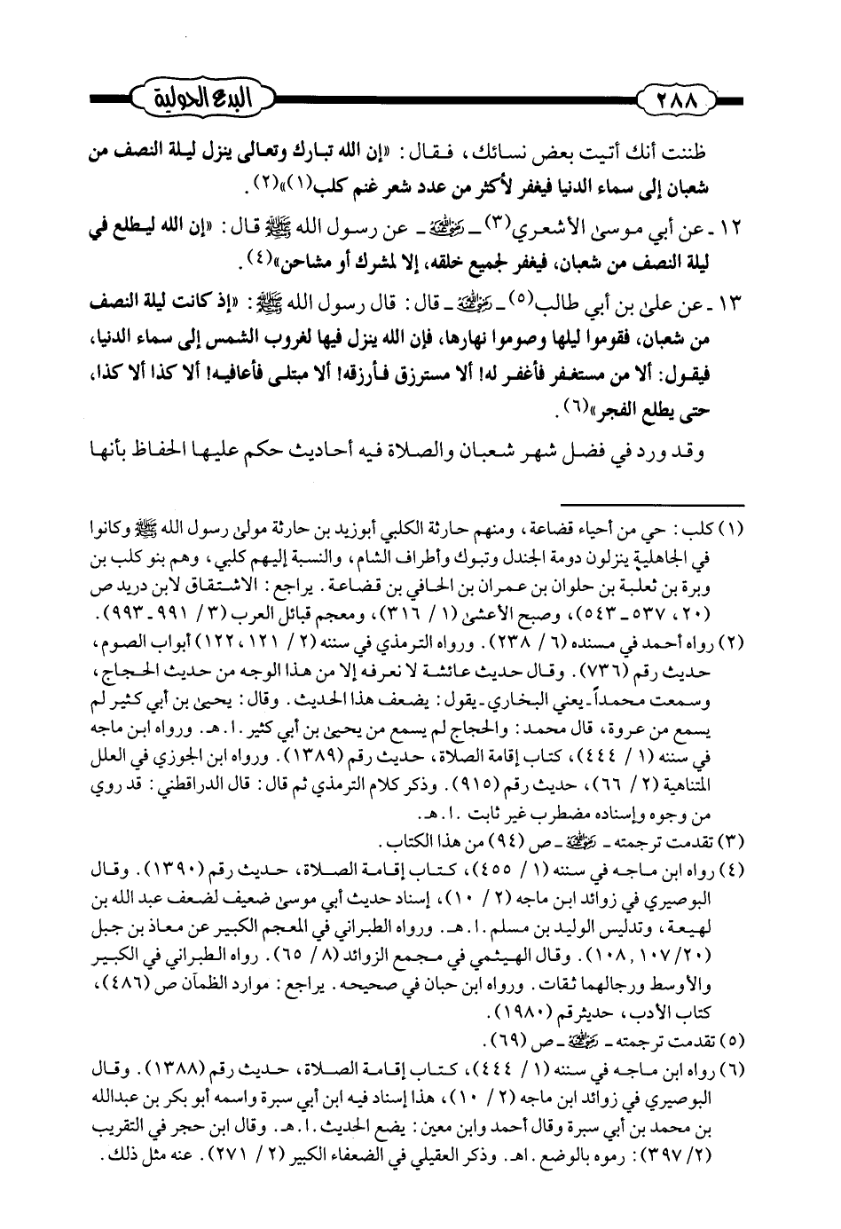 ظننت أنك أتيت بعض نسائك، فقال: ((إن الله تبارك وتعالى ينزل ليلة النصف من شعبان إلى سماء الدنيا فيغفر لأكثر من عدد شعر غنم كلب (¬1)) ) (¬2) .