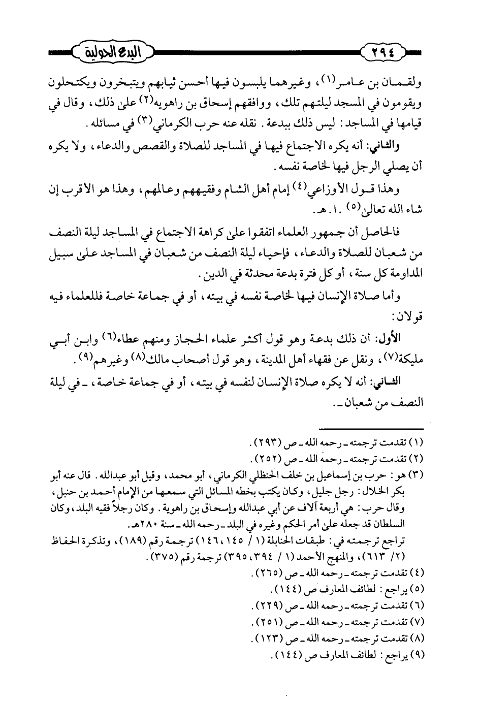 ولقمان بن عامر، وغيرهما يلبسون فيها أحسن ثيابهم ويتبخرون ويكتمون ويقومون في المسجد ليلتهم تلك، ووافقهم إسحاق بن راهويه على ذلك، وقال في قيامها في المساجد: ليس ذلك ببدعة. نقله عنه حرب الكرماني في مسائله.