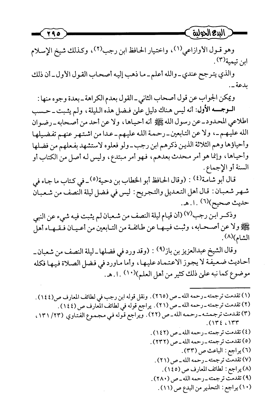 وقال الشيخ عبد العزيز بن باز: (وقد ورد في فضلها -ليلة النصف من شعبان- أحاديث ضعيفة لا يجوز الاعتماد عليها، وأما ما ورد في فضل الصلاة فيها فكله موضوع كما نبه على ذلك كثير من أهل العلم) (¬3) . ا. هـ.