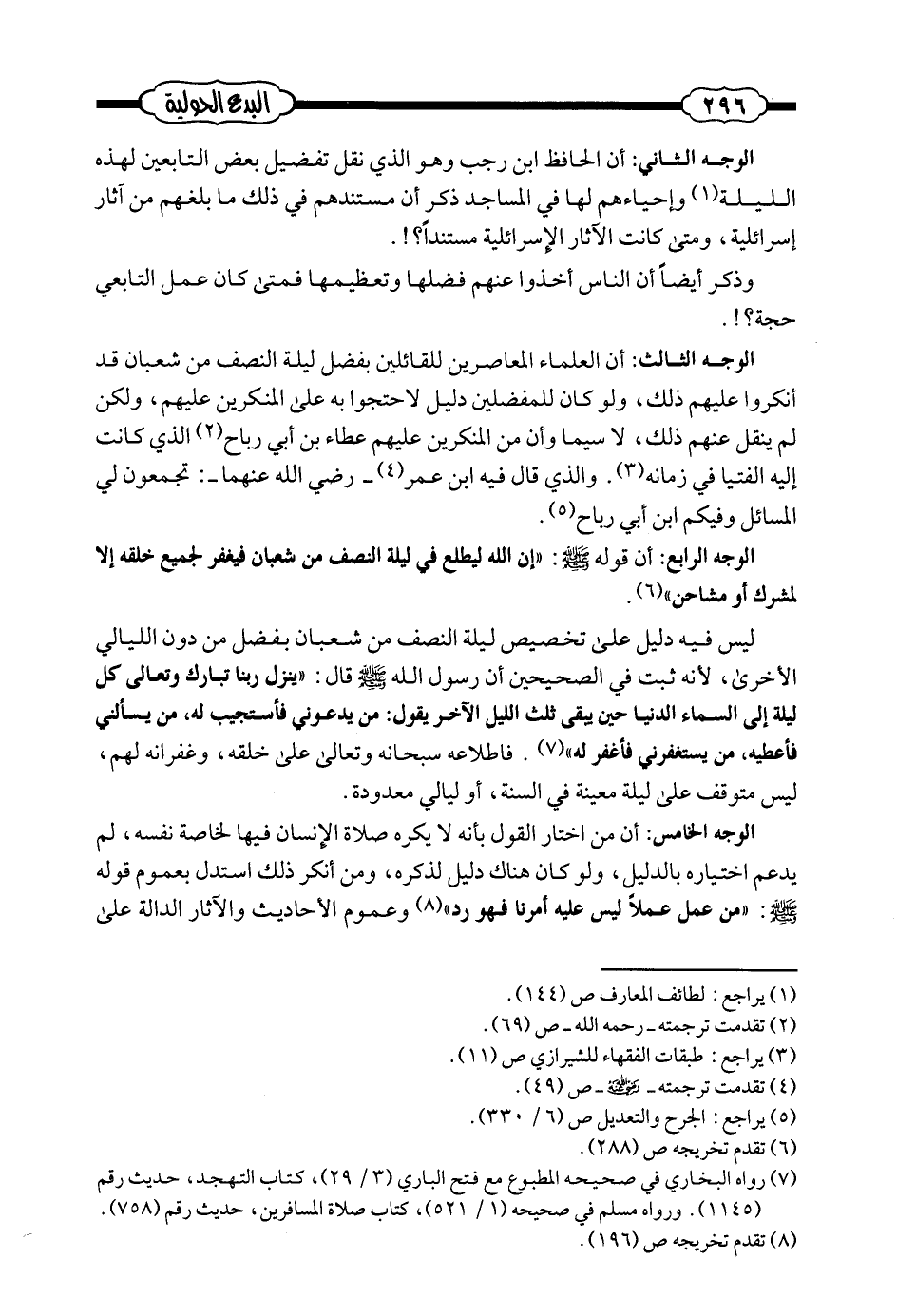الوجه الثاني: أن الحافظ ابن رجب وهو الذي نقل تفضيل بعض التابعين لهذه الليلة (¬1) وإحياءهم لها في المساجد ذكر أن مستندهم في ذلك ما بلغهم من آثار إسرائيلية، ومتى كانت الآثار الإسرائيلية مستنداً؟!.