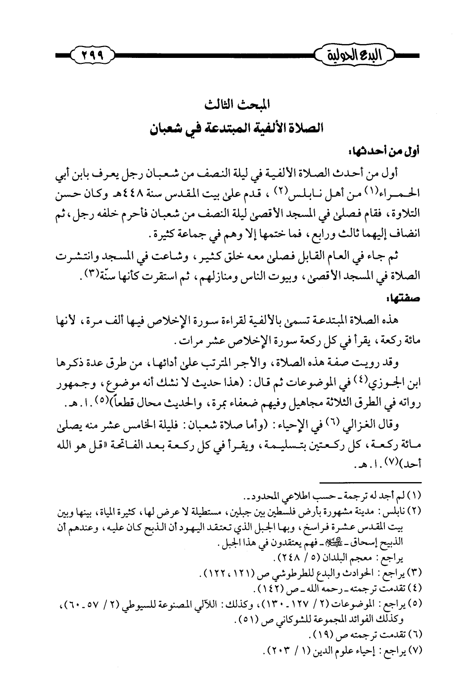 أول من أحدث الصلاة الألفية في ليلة النصف من شعبان رجل يعرف بابن أبي الحمراء من أهل نابلس (¬1) ، قدم على بيت المقدس سنة 448هـ وكان حسن التلاوة، فقام فصلى في المسجد الأقصى ليلة النصف من شعبان فأحرم خلفه رجل، ثم انضاف إليهما ثالث ورابع، فما ختمها إلا وهم في جماعة كثيرة.