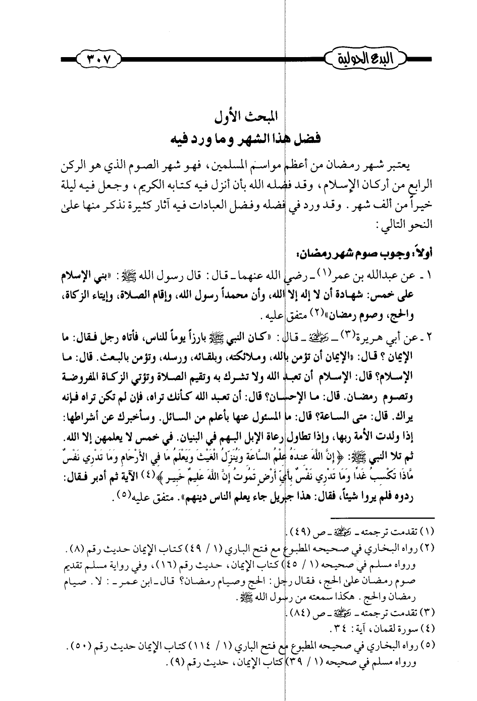 (¬1) - رواه البخاري في صحيحه المطبوع مع فتح الباري (1/49) ، كتاب الإيمان، حديث رقم (8) . ورواه مسلم في صحيحه (1/45) ، كتاب الإيمان، حديث رقم (16) . وفي رواية مسلم تقديم صوم رمضان على الحج، فقال رجل: الحج وصيام رمضان؟ قال - ابن عمر -: لا. صيام رمضان والحج هكذا سمعته من رسول الله صلى الله عليه وسلم