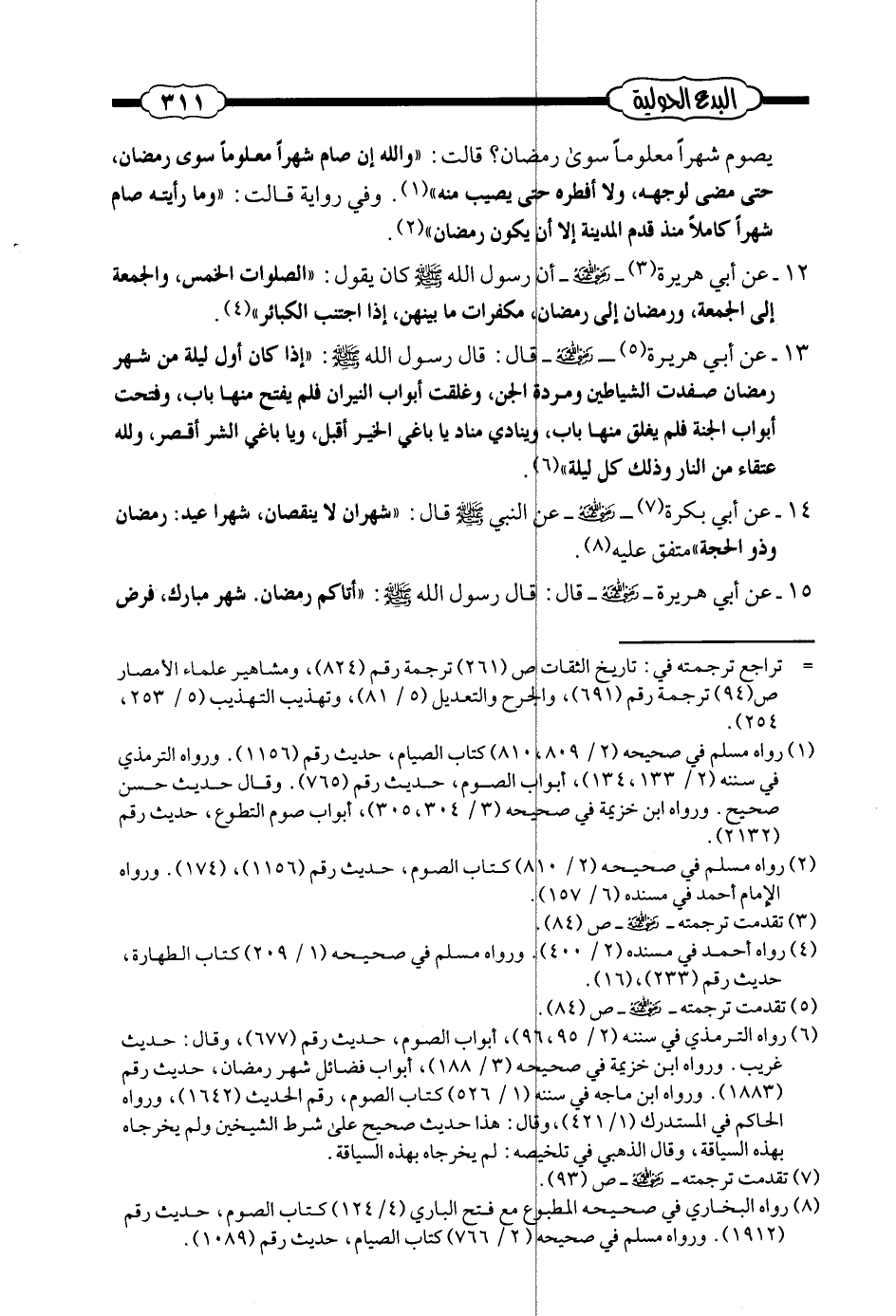 (¬4) - رواه الترمذي في سننه (2/95، 96) ، أبواب الصوم حديث رقم (677) . وقال: حديث غريب. ورواه ابن خزيمة في صحيحه (3/188) أبواب فضائل شهر رمضان، حديث رقم (1883) . ورواه ابن ماجه في سننه (1/526) كتاب الصوم، رقم الحديث (1642) ، ورواه الحاكم في المستدرك (1/421) ، وقال: هذا حديث صحيح على شرط الشيخين ولم يخرجاه بهذه السياقة، وقال الذهبي في تلخيصه: لم يخرجاه بهذه السياقة.