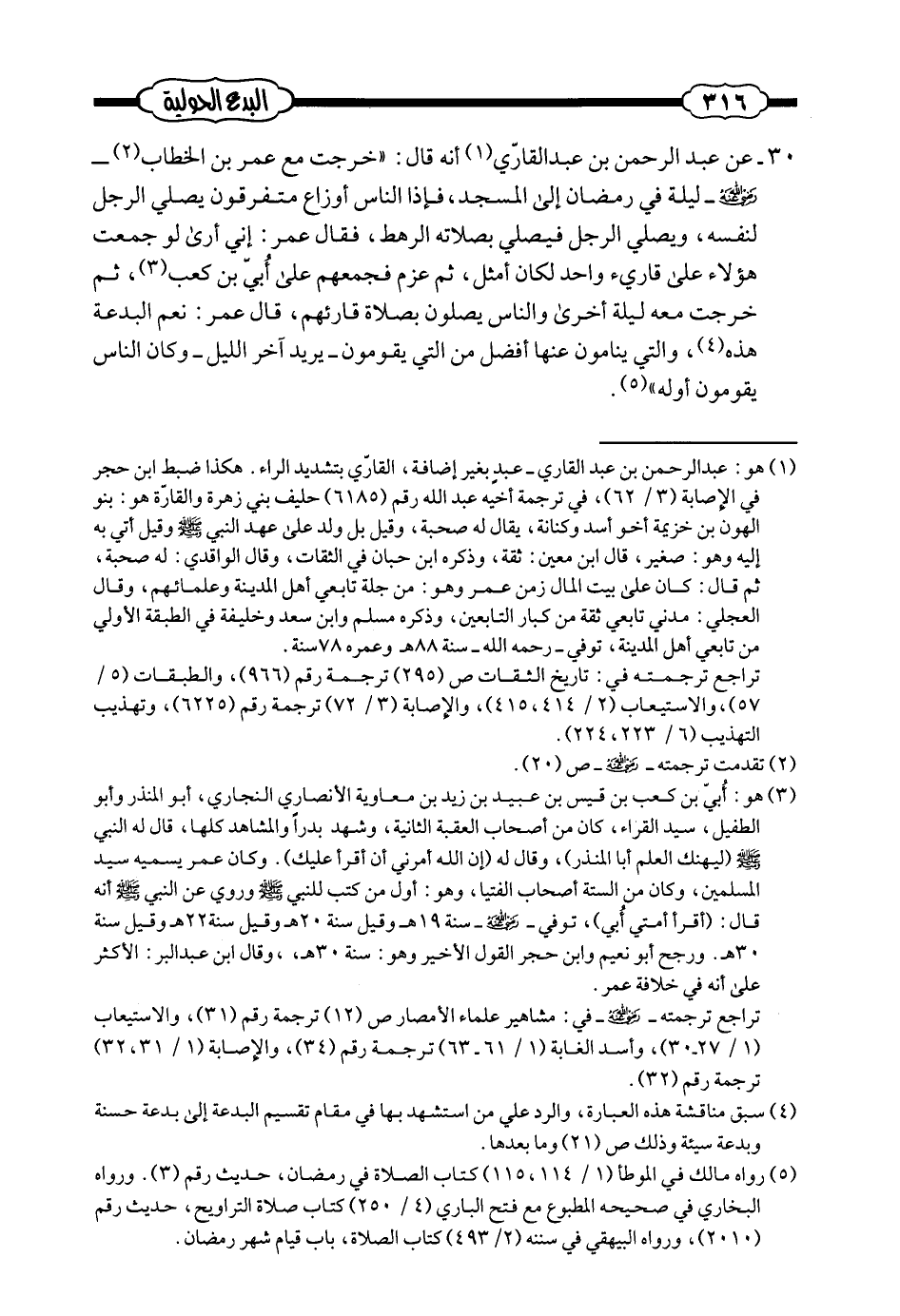 عن عبد الرحمن بن عبد القادرّي أنه قال: ((خرجت مع عمر بن الخطاب-رضي الله عنه- ليلة في رمضان إلى المسجد، فإذا الناس أوزاع متفرقون يصلي الرجل لنفسه، ويصلي الرجل فيصلي بصلاته الرهط، فقال عمر: إني أرى لو جمعت هؤلاء على قارئ واحد لكان أمثل، ثم عزم فجمعهم على أُبي بن كعب، ثم خرجت معه ليلة أخرى والناس يصلون بصلاة قارئهم، قال عمر: نعم البدعة هذه، والتي ينامون عنها أفضل من التي يقومون -يريد آخر الليل- وكان الناس يقومون أوله)) (¬1) .