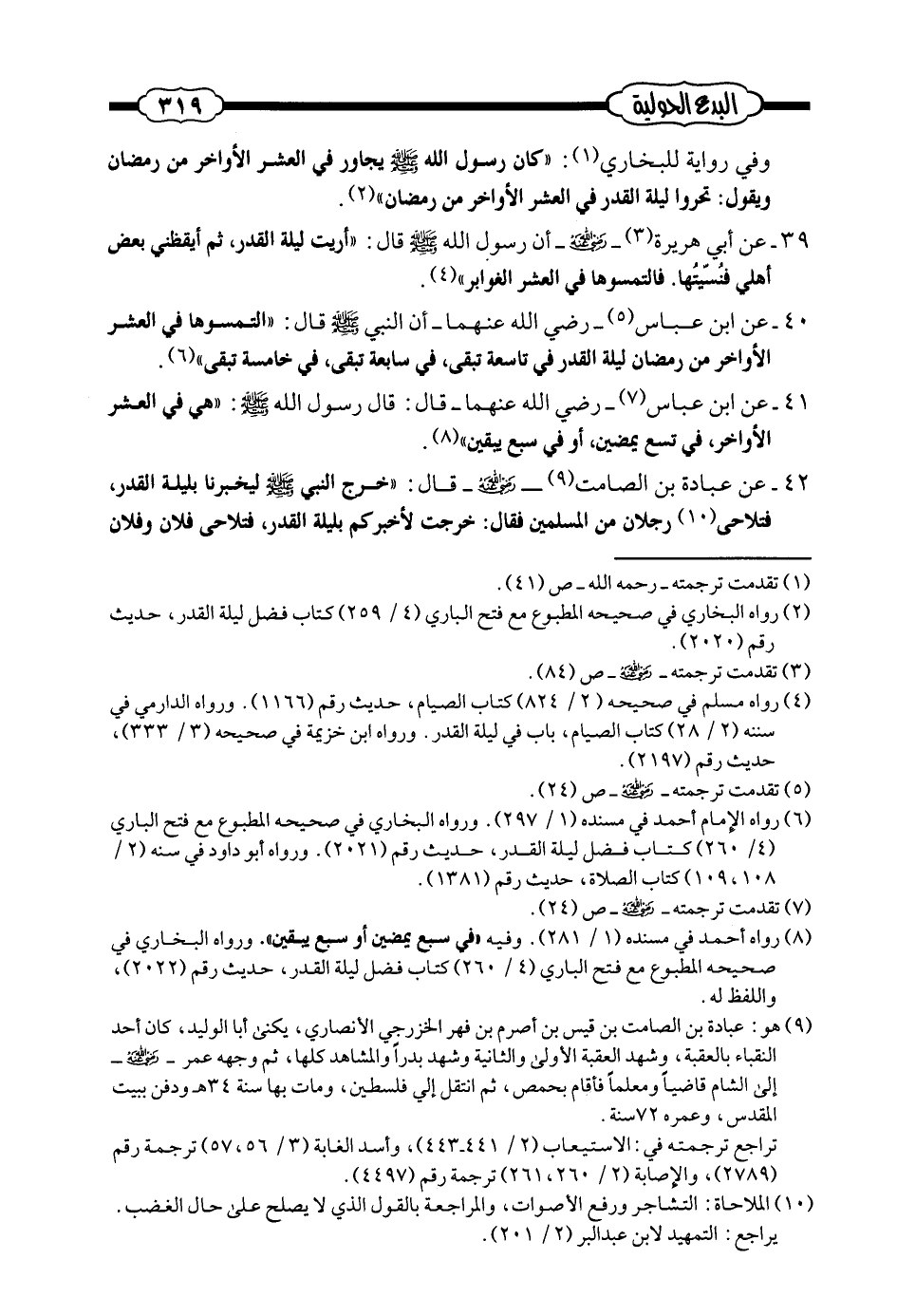 (¬4) - رواه الإمام أحمد في مسنده (1/ 281) . وفيه ((في سبع يمضين أو سبه يبقين ورواه البخاري في صحيحه المطبوع مع فتح الباري (4/260) كتاب فضل ليلة القدر، حديث رقم (2022) . واللفظ له
