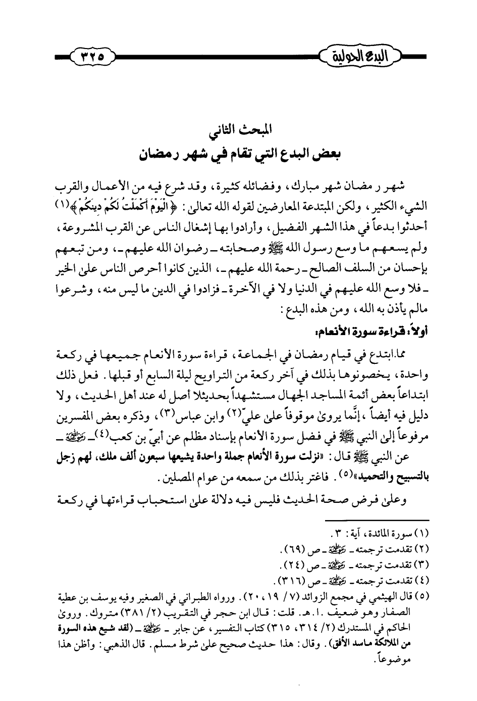 مما ابتدع في قيام رمضان في الجماعة، قراءة سورة الأنعام جميعها في ركعة واحدة، يخصونها بذلك في آخر ركعة من التراويح ليلة السابع أو قبلها. فعل ذلك ابتداعاً بعض أئمة المساجد الجهال مستشهداً بحديث لا أصل له عند أهل الحديث، ولا دليل فيه أيضاً، إنما يروى موقوفاً على علي وابن عباس، وذكره بعض المفسرين مرفوعاً إلى النبي صلى الله عليه وسلم في فضل سورة الأنعام بإسناد مظلم عن أبي بن كعب -رضي الله عنه- عن النبي صلى الله عليه وسلم قال: ((نزلت سورة الأنعام جملة واحدة يشيعها سبعون ألف ملك، لهم زجل بالتسبيح والتحميد)) (¬2) . فاغتر بذلك من سمعه من عوام المصلين.