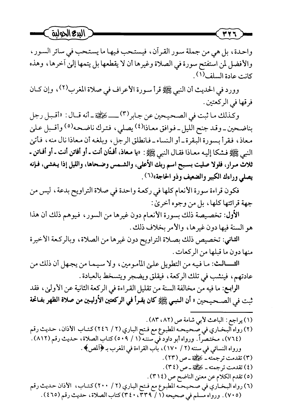 فكون قراءة سورة الأنعام كلها في ركعة واحدة في صلاة التراويح بدعة، ليس من جهة قرائتها كلها، بل من وجوه أخرى: