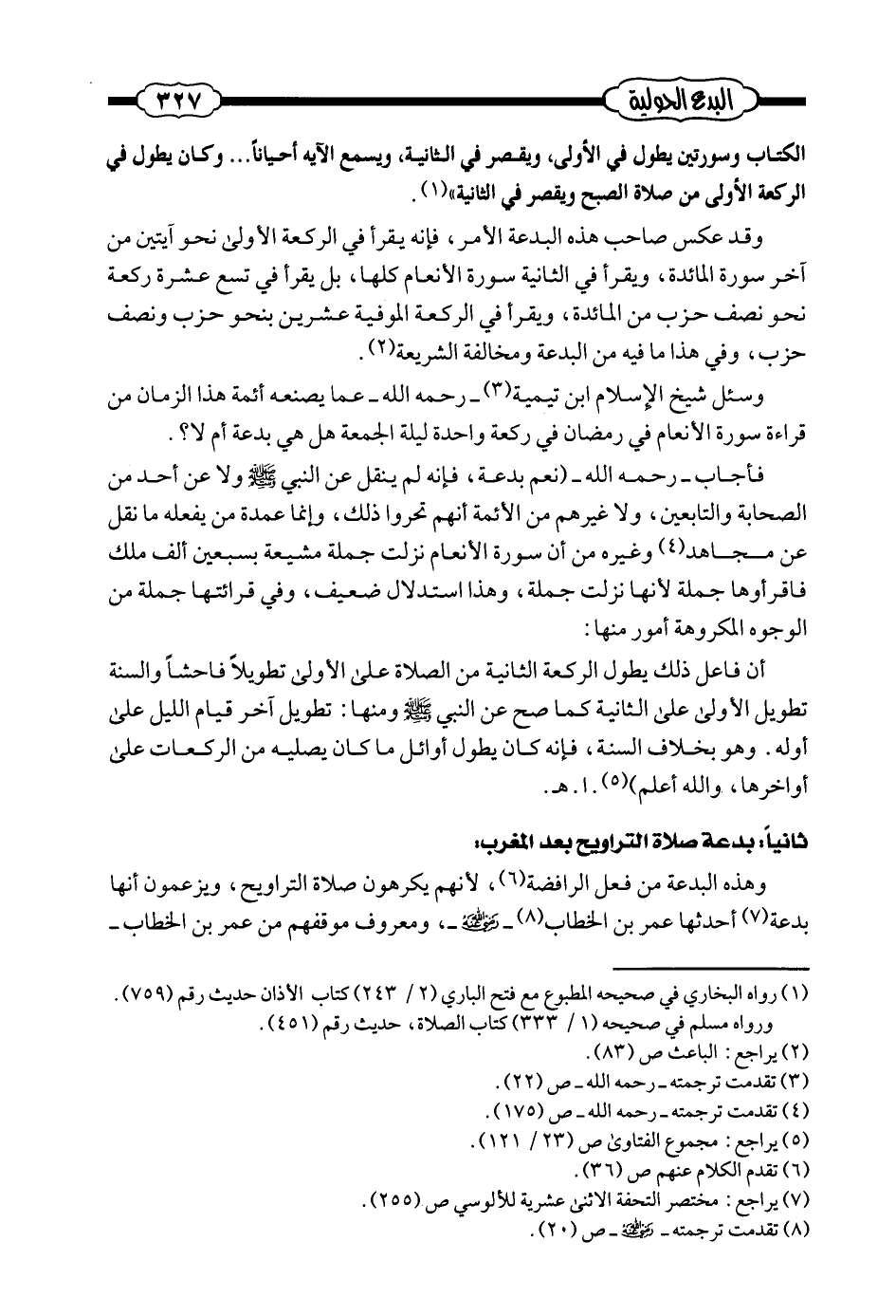 وقد عكس صاحب هذه البدعة الأمر، فإنه يقرأ في الركعة الأولى نحو آيتين من آخر سورة المائدة، ويقرأ في الثانية سورة الأنعام كلها، بل يقرأ في تسع عشرة ركعة نحو نصف حزب المائدة، ويقرأ في الركعة الموفية عشرين بنحو حزب ونصف حزب، وفي هذا ما فيه من البدعة ومخالفة الشريعة (¬2) .