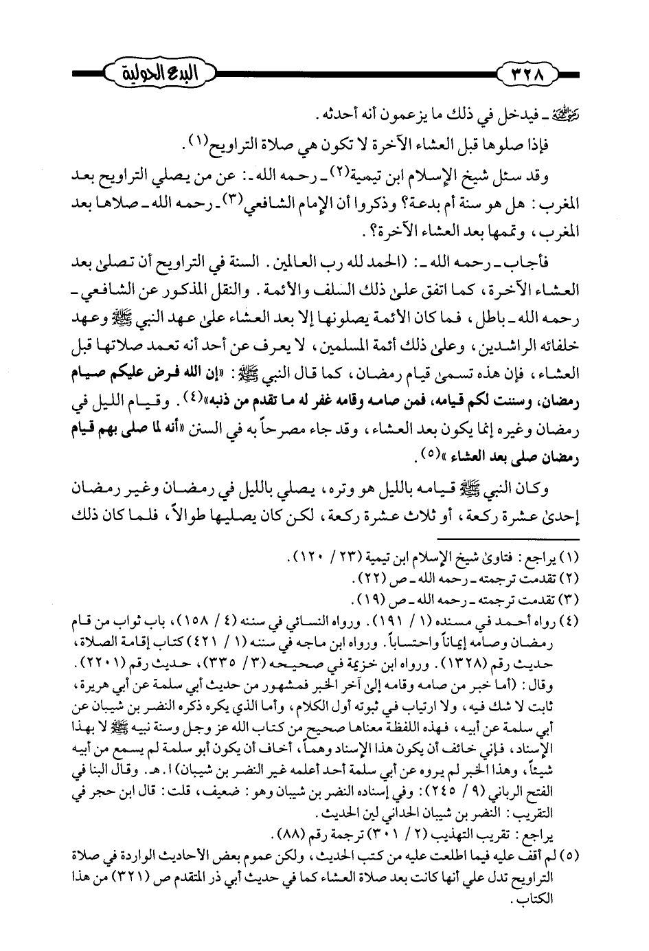(¬3) - لم أقف عليه فيما اطلعت عليه من كتب الحديث، ولكن عموم بعض الأحاديث الواردة في صلاة التراويح تدل على أنها كانت بعد صلاة العشاء كما في حديث أبي ذر المتقدم في هذا الكتاب.
