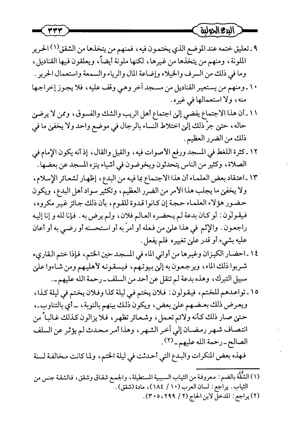 تواعدهم للختم، فيقولون: فلان يختم في ليلة كذا وفلان يختم في ليلة كذا، ويعرض ذلك بعضهم على بعض، ويكون ذلك بينهم بالنوبة - أي بالتناوب-، حتى صار ذلك كأنه ولائم تعمل، وشعائر تظهر، فلا يزالون كذلك غالباً من انتصاف شهر رمضان إلى آخر الشهر، وهذا أمر محدث لم يؤثر على السلف الصالح -رحمة الله عليهم - (¬2) .