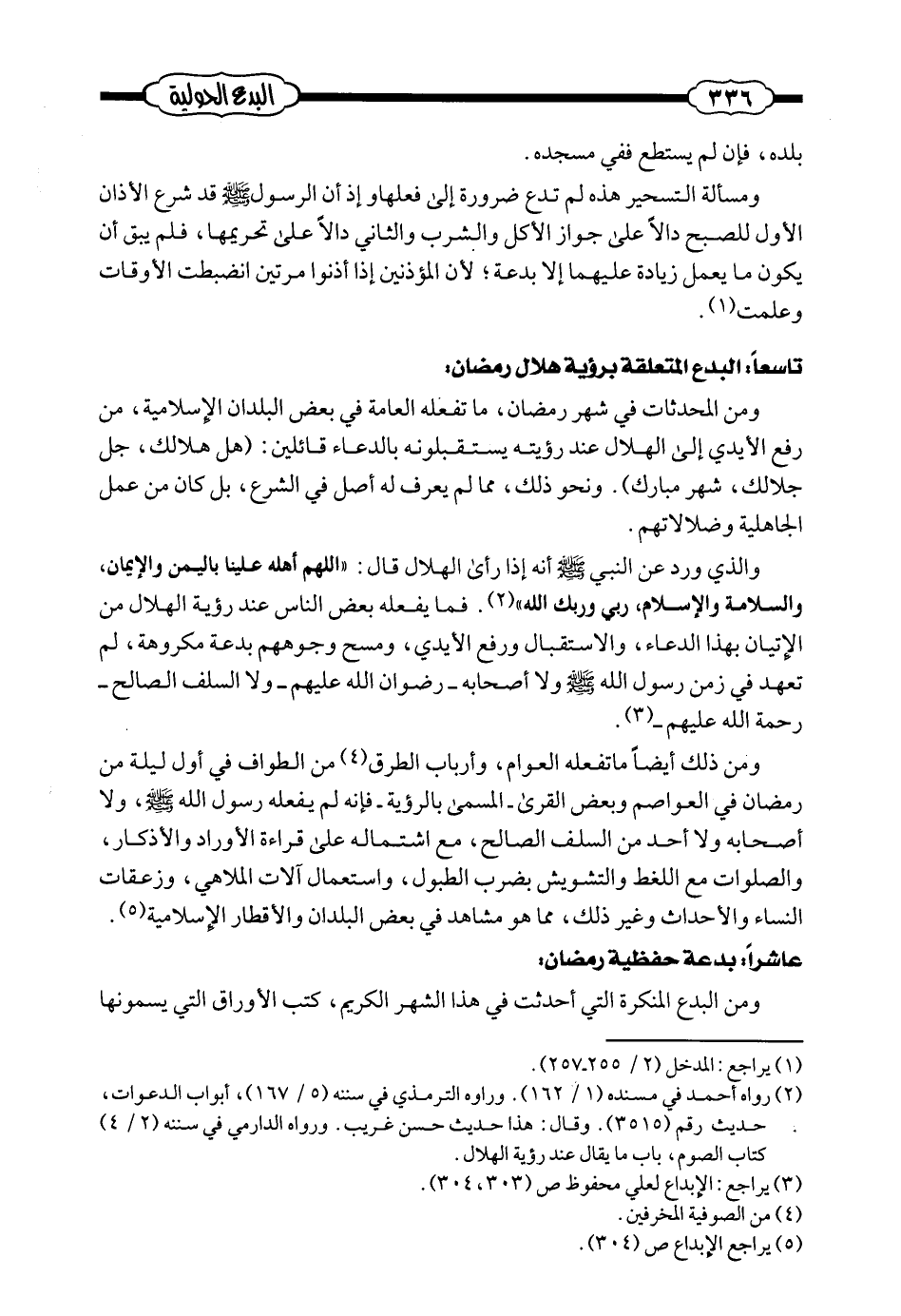 ومن ذلك أيضاً ما تفعله العوام، وأرباب الطرق (¬4) من الطواف في أول ليلة من رمضان في العواصم وبعض القرى -المسمى بالرؤية- فإنه لم يفعله رسول الله صلى الله عليه وسلم، ولا أصحابه ولا أحد من السلف الصالح، مع اشتماله على قراءة الأوراد والأذكار، والصلوات مع اللغط والتشويش بضرب الطبول، واستعمال آلات الملاهي، وزعقات النساء والأحداث وغير ذلك، مما هو مشاهد في بعض البلدان والأقطار الإسلامية (¬5) .