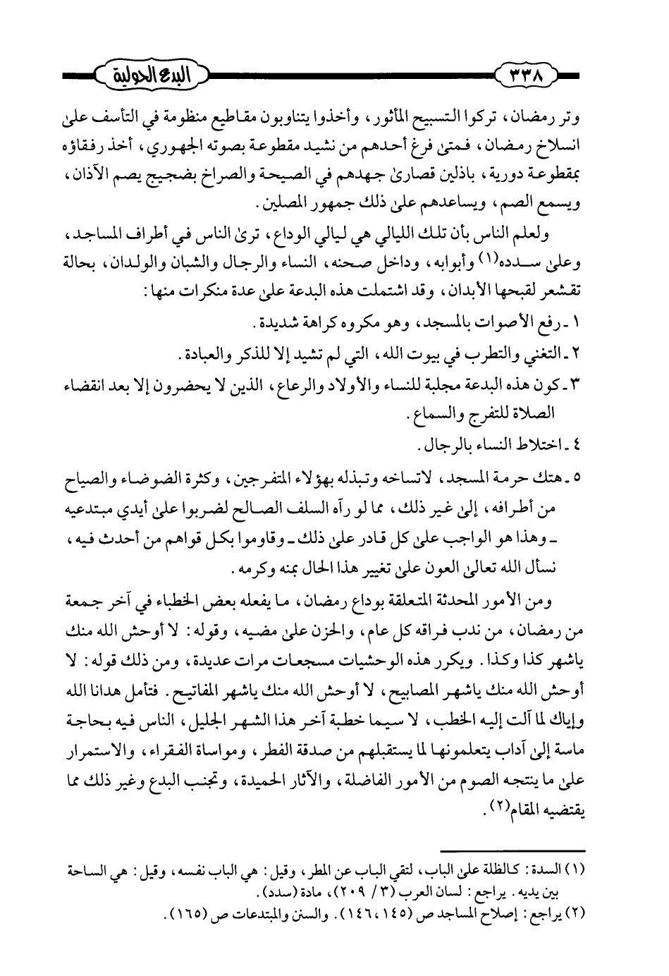 ومن الأمور المحدثة المتعلقة بوداع رمضان، ما يفعله بعض الخطباء في آخر جمعة من رمضان، من ندب فراقه كل عام، والحزن على مضيه، وقوله: لا أوحش الله منك يا شهر كذا وكذا. ويكرر هذه الوحشيات مسجعات مرات عديدة، ومن ذلك قوله: لا أوحش الله منك يا شهر المصابيح، لا أوحش الله منك يا شهر المفاتيح. فتأمل هدنا الله وإياك لما آلت إليه الخطب، لاسيما خطبة آخر هذا الشهر الجليل، الناس فيه بحاجة ماسة إلى آداب يتعلمونها لما يستقبلهم من صدقة الفطر، ومواساة الفقراء، والاستمرار على ما ينتجه الصوم من الأمور الفاضلة، والآثار الحميدة، وتجنب البدع وغير ذلك مما يقتضيه المقام (¬2) .