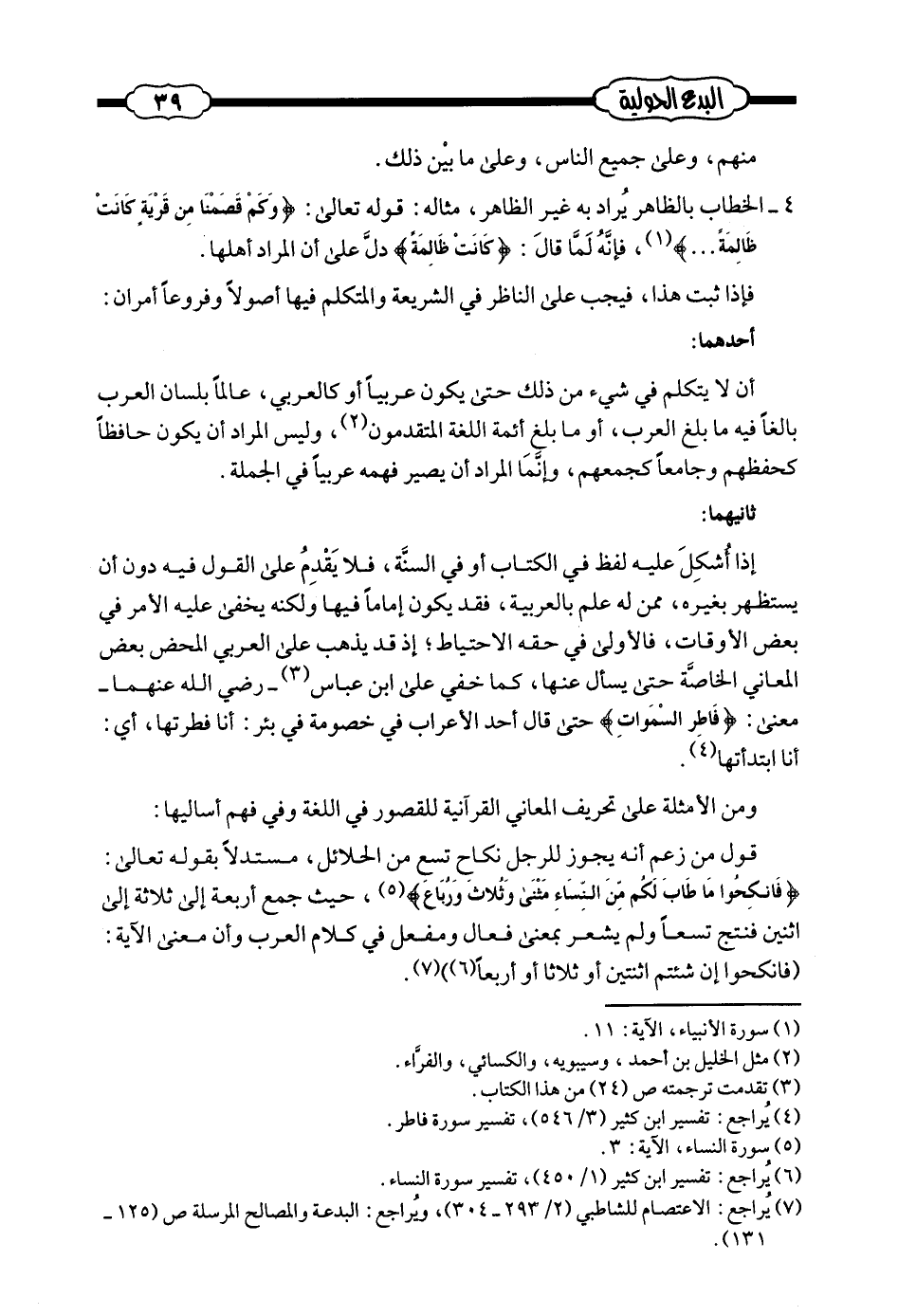 أن لا يتكلم في شيء من ذلك حتى عربياً أوكالعربي، عالماً بلسان العرب بالغاً فيه ما بلغ العرب، أو ما بلغ أئمة اللغة المتقدمون (¬2) ، وليس المراد أن يكون حافظاً كحفظهم وجامعاً كجمعهم، وأنَّما المراد أن يصير فهمه عربياً في الجملة.