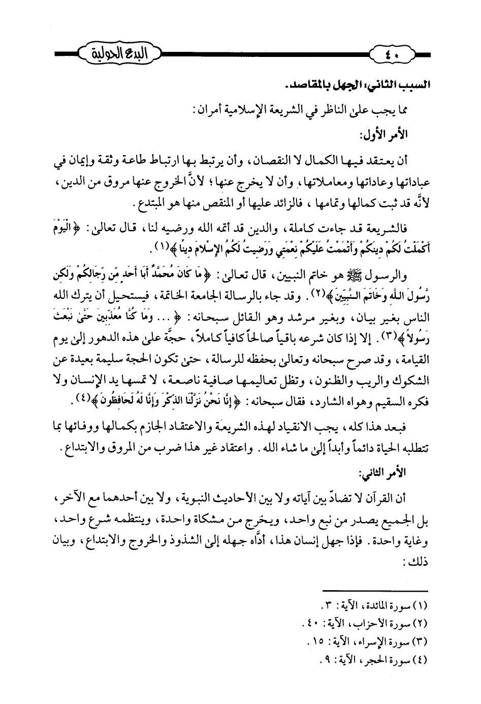 أن القرآن لا تضاد بين آياته ولا بين الأحاديث النبوية، ولا بين أحدهما مع الآخر، بل الجميع يصدر من نبع واحد، ويخرج من مشكاة واحدة، وينتظمه شرع واحد، وغاية واحدة. فإذا جهل إنسان هذا، أداة جهله إلى الشذوذ والخروج والابتداع، وبيان ذلك: