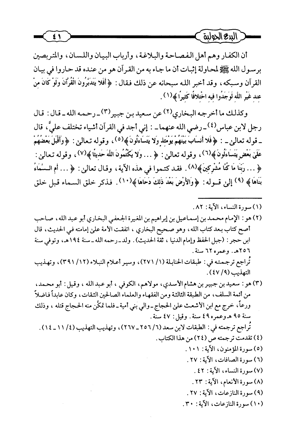 وكذلك ما أخرجه البخاري عن سعيد بن جبير - رحمه الله - قال: قال رجل لابن عباس - رضي الله عنهما -: إني أجد في القرآن أشياء تختلف عليَّ، قال -قوله تعالى-: {فَلا أَنْسَابَ بَيْنَهُمْ يَوْمَئِذٍ وَلا يَتَسَاءَلُونَ} (¬2) ، قوله تعالى {وَأَقْبَلَ بَعْضُهُمْ عَلَى بَعْضٍ يَتَسَاءَلُونَ} (¬3) ، قوله تعالى { ... وَلا يَكْتُمُونَ اللَّهَ حَدِيثاً} (¬4) ، قوله تعالى {رَبِّنَا مَا كُنَّا مُشْرِكِينَ} (¬5) . فقد كتموا في هذه الآية، وقال تعالى: {....أَمِ السَّمَاءُ بَنَاهَا} (¬6) إلى قوله: {وَالْأَرْضَ بَعْدَ ذَلِكَ دَحَاهَا} (¬7) . فذكر خلق السماء قبل خلق