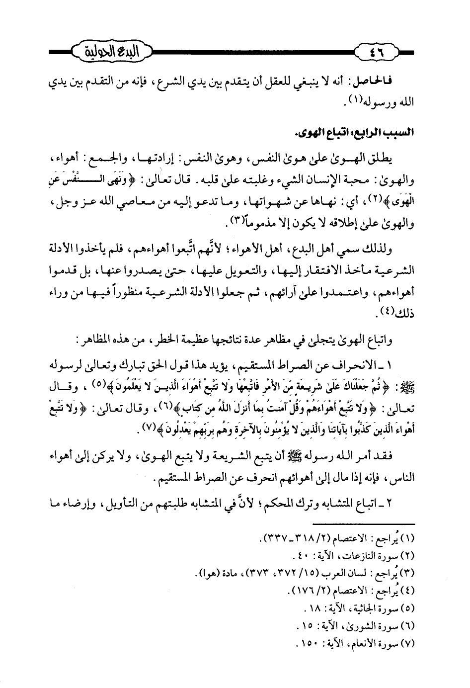 الانحراف عن الصراط المستقيم، يؤيد هذا قول الحق تبارك وتعالى لرسوله صلى الله عليه وسلم: {ثُمَّ جَعَلْنَاكَ عَلَى شَرِيعَةٍ مِنَ الْأَمْرِ فَاتَّبِعْهَا وَلا تَتَّبِعْ أَهْوَاءَ الَّذِينَ لا يَعْلَمُونَ} (¬5) ، وقول تعالى: {وَلا تَتَّبِعْ أَهْوَاءَهُمْ وَقُلْ آمَنْتُ بِمَا أَنْزَلَ اللَّهُ مِنْ كِتَابٍ} (¬6) ، وقال تعالى: {وَلا تَتَّبِعْ أَهْوَاءَ الَّذِينَ كَذَّبُوا بِآياتِنَا وَالَّذِينَ لا يُؤْمِنُونَ بِالْآخِرَةِ وَهُمْ بِرَبِّهِمْ يَعْدِلُونَ} (¬7) .